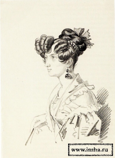 Конец 1820-х Бумага, соус. 35,5 * 25,5 На обороте наклейка с надписью: Находился въ им. «Пор?чье»/Гр. Уваровой. Подаренъ мн? /1910 г. 12 Іюня. /Княжна Анна Александровна / Щербатова (дочъ Кн. Александра / Александровича и Кн. Прасковьи / Серг. Щербатовыхъ, ур. Кн. Одоевской)./Зам. с 1833 за Ген. маіоромъ Павломъ /Константиновичемъ Александровымъ.