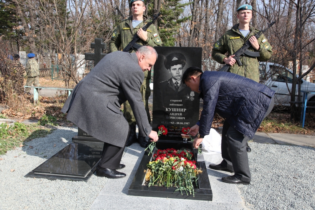 Открытие памятника старшему лейтенанту Андрею Борисовичу Кушниру состоялось в нулевом секторе городского кладбища Уссурийска. В мероприятии приняли участие глава Уссурийского городского округа, секретарь местного отделения партии "Единая Россия" Николай Рудь, депутат Законодательного Собрания Приморского края Валерий Кан, представители политических партий, ветеранских и общественных организаций, студенты и учащиеся.
