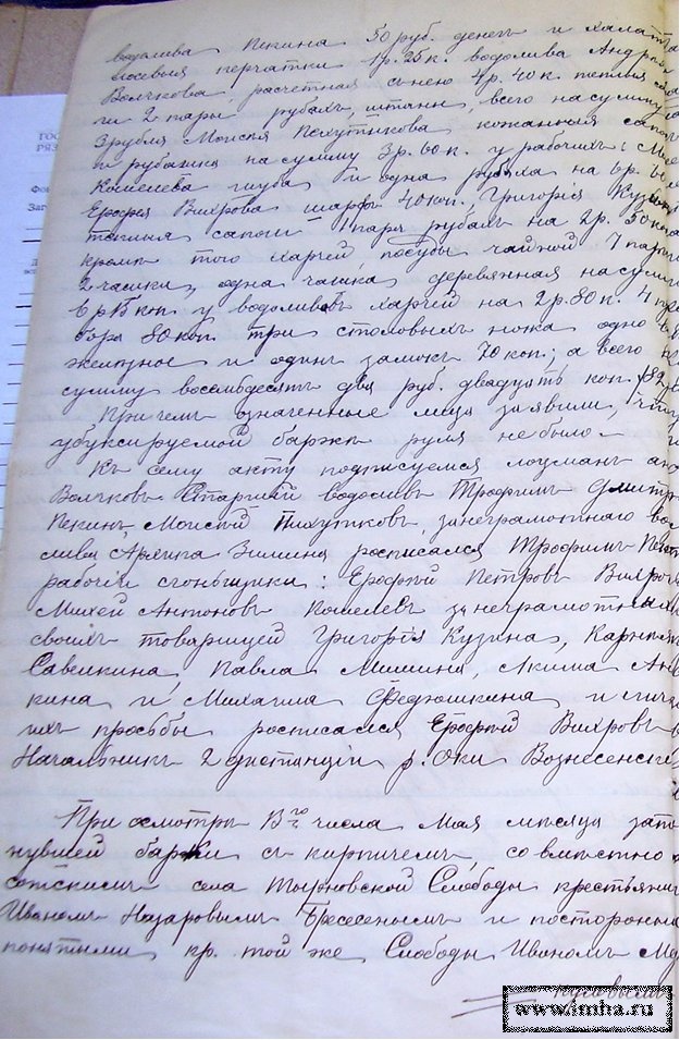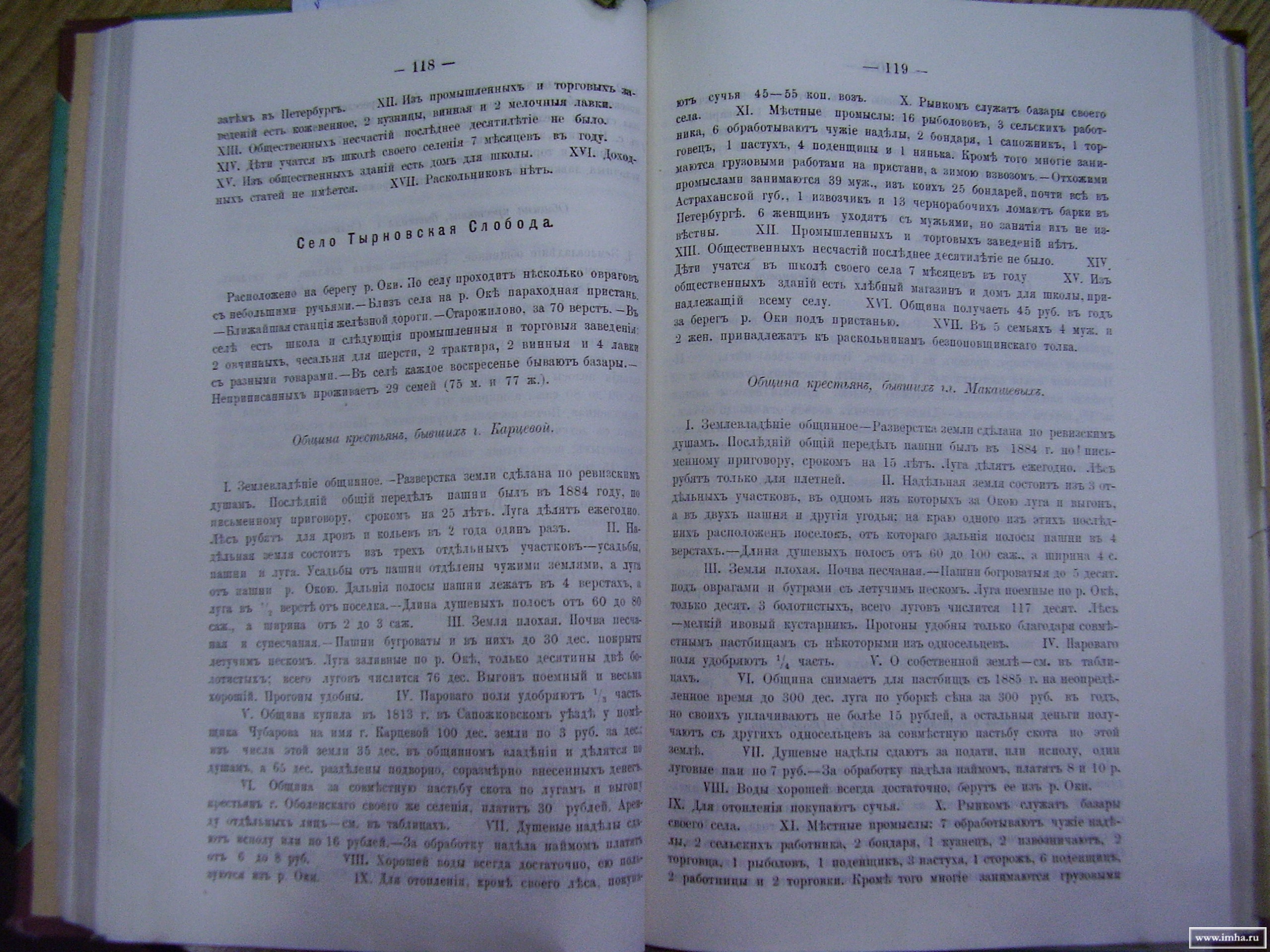 за вдовою княгинею Авдотьею Федоровною князь Ивановскою женою княж Данилова сына Великогагина и за сыном ея князь Николаем Ивановичем Великогагиным 74 двора ис того числа ис 5 дворов обмерли изо 6 дворов бежали а ныне жилых двор вотченников да салдацких жен и матерей 12 дворов крестьянских 52 двора всего жилых 65 дворов и других жилых изб не тех дворех 11 в вотчинниковом дворе прикащик ... (л.60об.) В том же селе Тынорской слободе за стольником Яковом Григорьевым сыном Порошиным крестьянские дворы ... (л.61) ... а в переписных книгах 186-го году написано было за Григорьем Демидовым сыном Порошиным 7 дворов ис того числа ис 3 дворов обмерли а ныне за стольником Яковом Григорьевым сыном Порошиным крестьянских 4 двора ... В том же селе Тынорской слободе за недорослем Иваном Васильевым сыном Андреяновым крестьянские дворы ... (л.61об.) ... да сведенных 2 двора ... в Шацкой уезд в село Каспища да обмерли дворами ... вышла замуж в Шацкой уезд в село Дереветина а по переписным книгам 186-го году написано за Семеном да за Алексеем Васильевыми детьми Собакиными 11 дворов сведены да ис трех дворов бежали из дву дворов сведены да ис 3 дворов обмерли а ныне за недорослем Иваном Васильевым сыном Ондреяновым крестьянских жилых 4 двора ... (л.62)