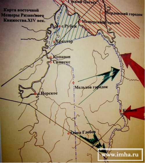 В ответ, в 1377 г. Мамай, направил царевича Арапшу (Араб-шаха) вернуть мордовско-болгарские земли, бывшие в их подчинении. Арапша, на р. Пьяне полностью уничтожил суздальско-нижегородские войска. И сразу же нанес молниеносный удар по Рязанским землям, все, превратив в пепел. Мордовские князья по следам ордынцев "рассеялись злодействовать". В ответ Городецкий князь Борис Константинович, полностью опутошил мордовские земли и, полки потомков Всеволода Большое Гнездо стали на р. Цне - взяв под контроль важную военную и торговую коммуникацию, чем являлась Большая дорога из Рязани в Орду через Конобеевские земли. Сразу же, здесь был поставлен крепостной городок Кошков (Позже Раково-Кошков, ныне с. Раково в Сасовском р-не - А. К.). Правобережье Цны и Мокши, до Оки стало московским. Около этого же времени князь Мещерский Александр Укович продал свои земли Городец Мещерский (Касимов) и Мордовский Городок (Елатьма), в. кн. московскому Дмитрию Ивановичу. Под московский контроль была взята другая важная военная и торговая коммуникация, древнейший тракт Рязань-Муром. Збылась древнейшая мечта всех московских правителей о разделении муромо-рязанских земель. Рязанские действия были почти синхронны московским. Войска Олега Рязанского одновременно с московскими овладели левобережьем Цны и Мокши. Вот только земли лежащие напротив купленных московских мещерских городков, Олег Иванович купил еще раньше. Это была Ерахтурская Мещера, в треугольнике: Ерахтур-Сеитово-Гусский Погост, т. е. земли лежащие напротив будущих московских купленных земель.
