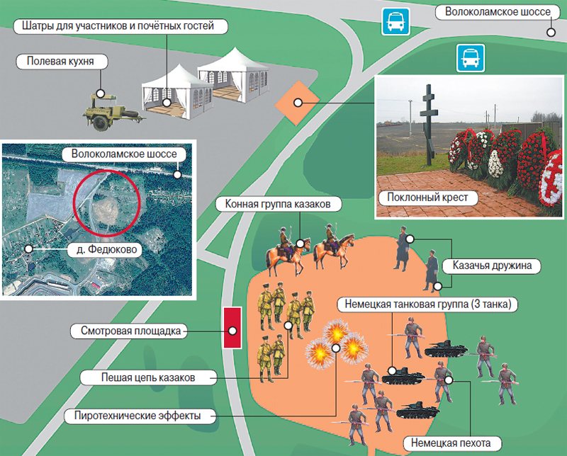 Именно там в первую осень войны несколько десятков казаков 37-го Армавирского полка совершили подвиг, отражая натиск немецких танков и штурмовых групп автоматчиков. Несмотря на отсутствие полноценного сна, отдыха, горячей пищи и значительное численное превосходство фашистских войск, кубанский эскадрон не дал немецким захватчикам прорвать линию обороны. Торжественная Вахта Памяти с возложением венков пройдёт у Поклонного креста, установленного в честь этих героев ВОВ, после чего состоится военно-историческая реконструкция самого боя (см. инфографику).