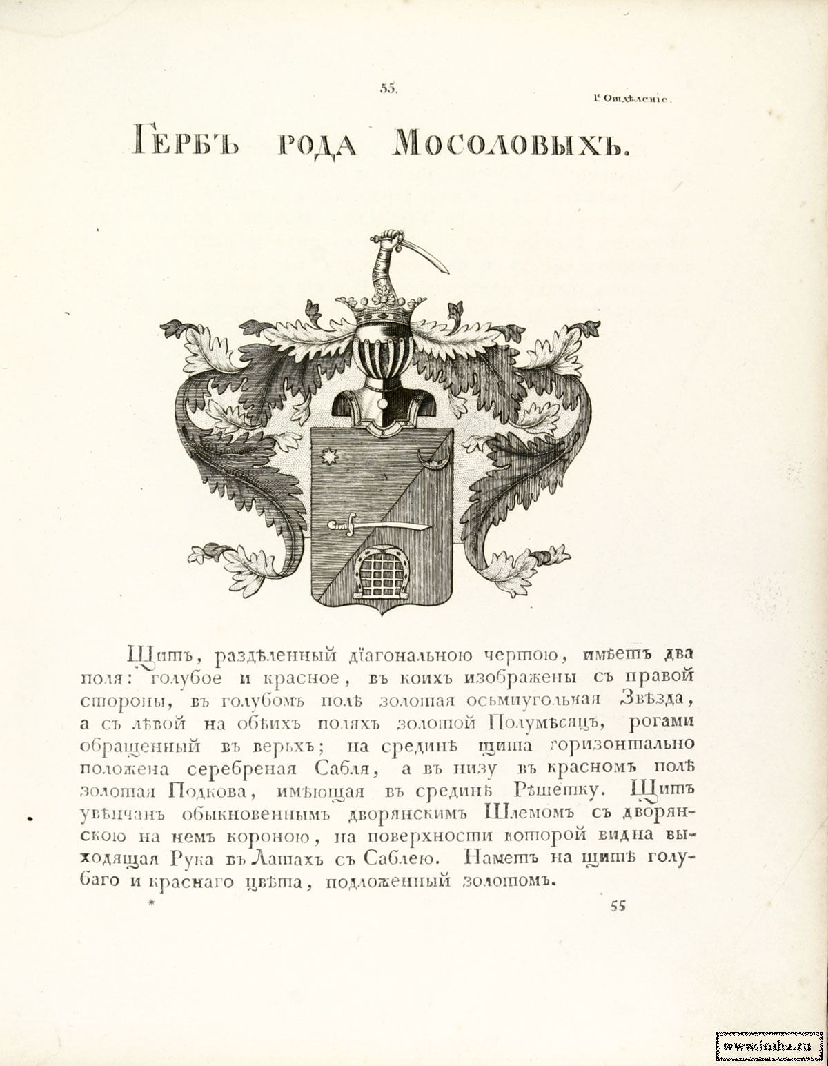 Герб Мосоловых помещен в Общий Гербовник (ч. IV, с. 55) и имеет следующее описание: "Щит, разделенный диагональной чертой, имеет два поля: голубое и красное; в которых изображены: с правой стороны, в голубом поле золотая восьмиугольная звезда, а с левой на обеих полях – полумесяц, обращенный рогами вверх; посредине щита горизонтально положена подкова, имеющая в середине решетку. Щит увенчан обыкновенным дворянским шлемом с дворянской на нем короной, на поверхности которой видна выходящая рука в латах и саблей. Намет на щите голубой и красный, подложенный золотом".