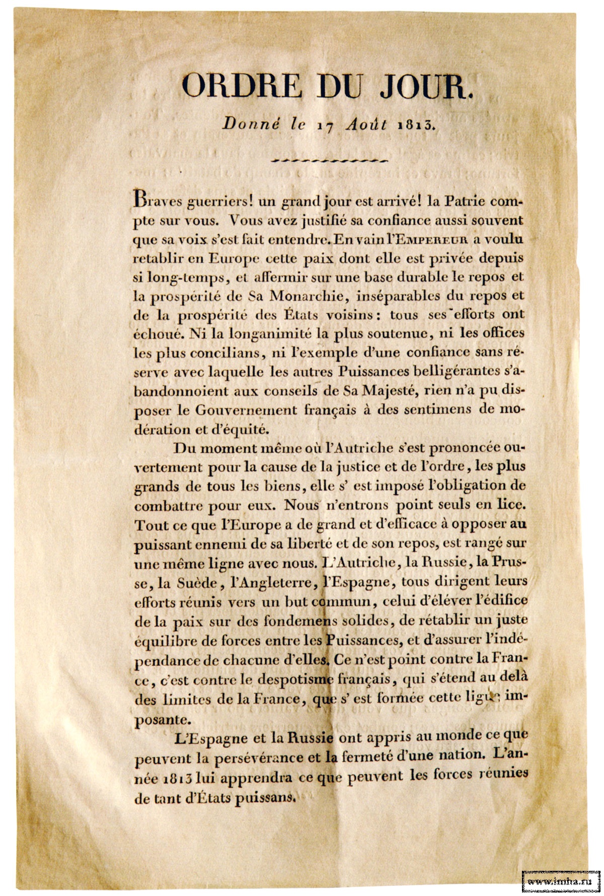 | Приказ фельдмаршала князя К.Ф. Шварценберга по австрийской армии о вступлении Австрии в число союзных держав, воюющих против Наполеона. 5/17 августа 1813 г. ГИМ. |