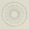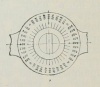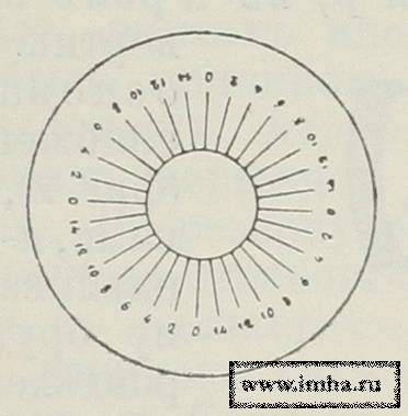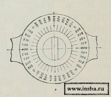 Таким образом, барабан с его делениями служит нониусом для диска d: Гониометр у скорострельной полевой пушки образца 97 и 1910 г. (фиг. 3) расположен на трубке прицельной вилки лафета и, в общем сходен с прежней системой Банжа, только несколько видоизменено расположение частей, например, барабан b помещен ниже диска d и разделен на 200 ч., причем каждое деление соответствует углу 1/16°, которого тангенс равен 0,001, т.-е. составляет тысячную долю дистанции; делений на диске сделано в каждой 1/4окружности 16 (фиг. 4) с обозначениями 0, 2, 4 и т. д., причем величина их в 100 раз более делений барабана; a т. к. деления на диске только четные, то поворот стойки на одно деление соответствует 200 тысячным дистанции.