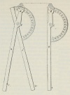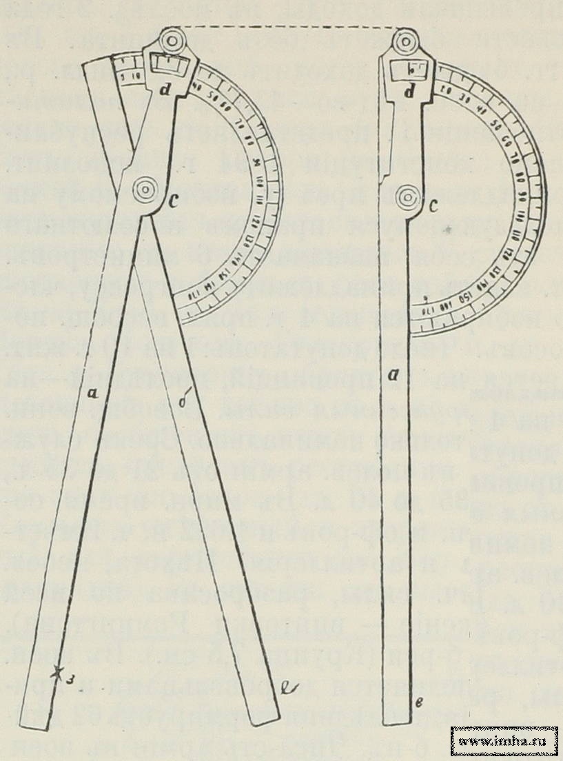 2) Прибор, употребляемый при подземных минных работах и служащий для нанесения на полу галерей углов поворота (изображен на фиг. 5), состоит из двух медных линеек a и b, длиной 2 фт., шириной 1 дм., соединенных шарниром c; одна из линеек снабжена медным полукругом, с делениями от 0° до 180°, а другая вырезом d и указателем. который м. быть закреплен на известном делении.