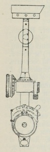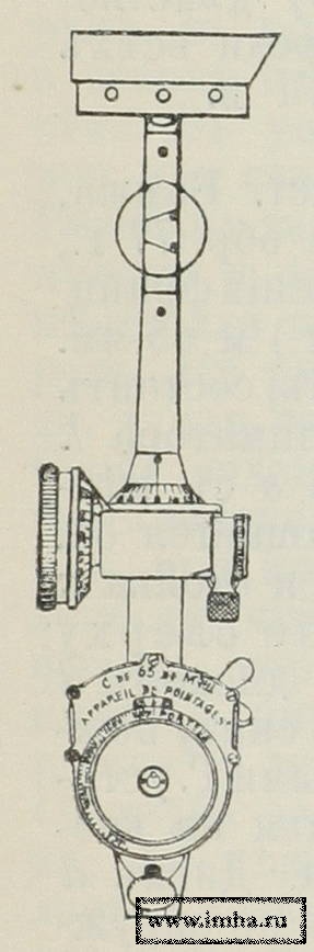 Хотя длина всей призмы коллиматора невелика (ок. 10 см.), т.-е. невелико действительное расстояние между глазом и крестовиною, но, благодаря соответствующему подбору стекол, это расстояние кажется глазу равным 1 м, что и составляет длину прицельной линии. Кроме поворотов на стойке s в стороны, коллиматор на горизонтальной оси с зажимом r и полкой f м. поворачиваться вверх и вниз. Вращением же нарезного маховичка барабана b при посредстве передачи, скрытой в стойке s, эту последнюю вместе с коллиматором можно вращать на части деления диска d, a именно, т. к. при полном обороте барабана черта t перемещается на одно деление диска и барабан b разделен на 100 ч., то помощью барабана стойку с коллиматором можно повернуть всего на 0,9° или на 5,4 мин.