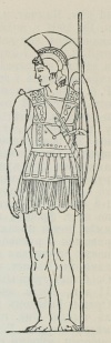 Гоплит был вооружен коротким мечем, который носился на левом боку, длинным копьем, приспособленным для удара, большим овальным или круглым щитом, метательными дротиками и пикой.