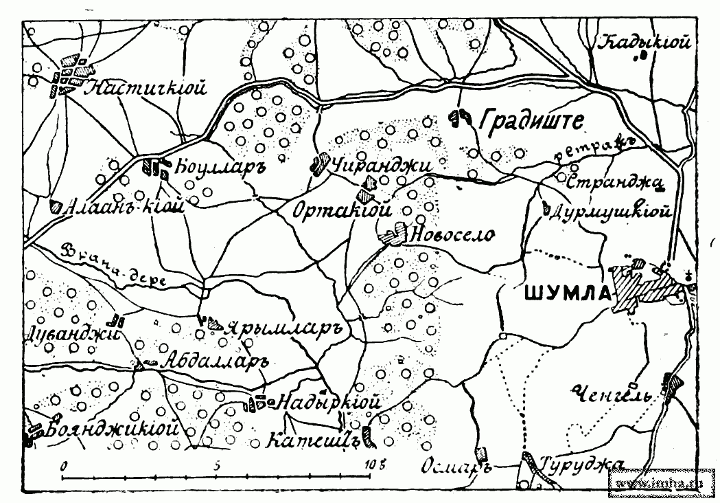 Отряд Полторацкого вышел на шоссе из Осман-Базара в Шумлу, пролегающее по широкому ущелью до с. Градиште. Не доходя около версты до Градиште, авангардный взвод заметил на возвышенности к югу пост турецкой кавалерии; в селении поднялось сильное смятение.