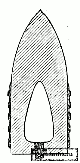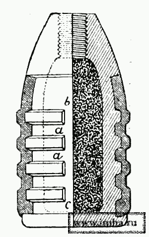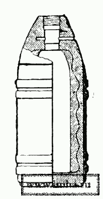 Для орудий, заряжаемых с дула, имелись снаружи готовые ребра или выступы из цинкового сплава (фиг. 4). Для заряжания с казны была первоначально принята толстая свинцовая оболочка (фиг. 5), затем для уменьшения мертвого груза — тонкая, припаиваемая к снаряду помощью довольно сложных приемов и средств (фиг. 6); однако, это дало возможность увеличить полезный вес сначала бронебойных Гранат, а затем и всех остальных, введя двойные стенки (кольчатые и сегментные Граната).