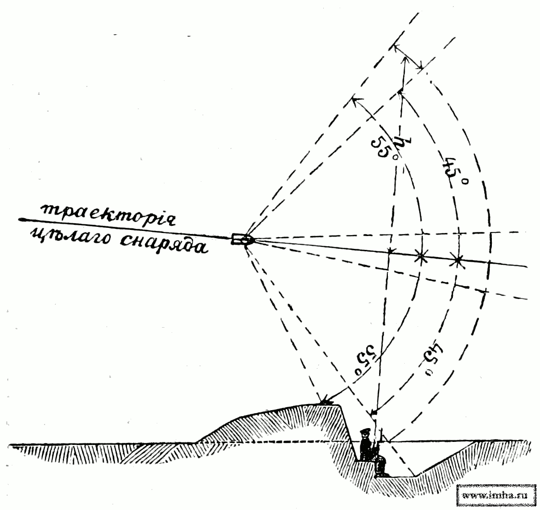 Угол разлета их настолько велик (фиг. 9), что снаряд обладает тылобойностью, т.-е. способностью поражать войска, стоящие непосредственно за прикрытием.