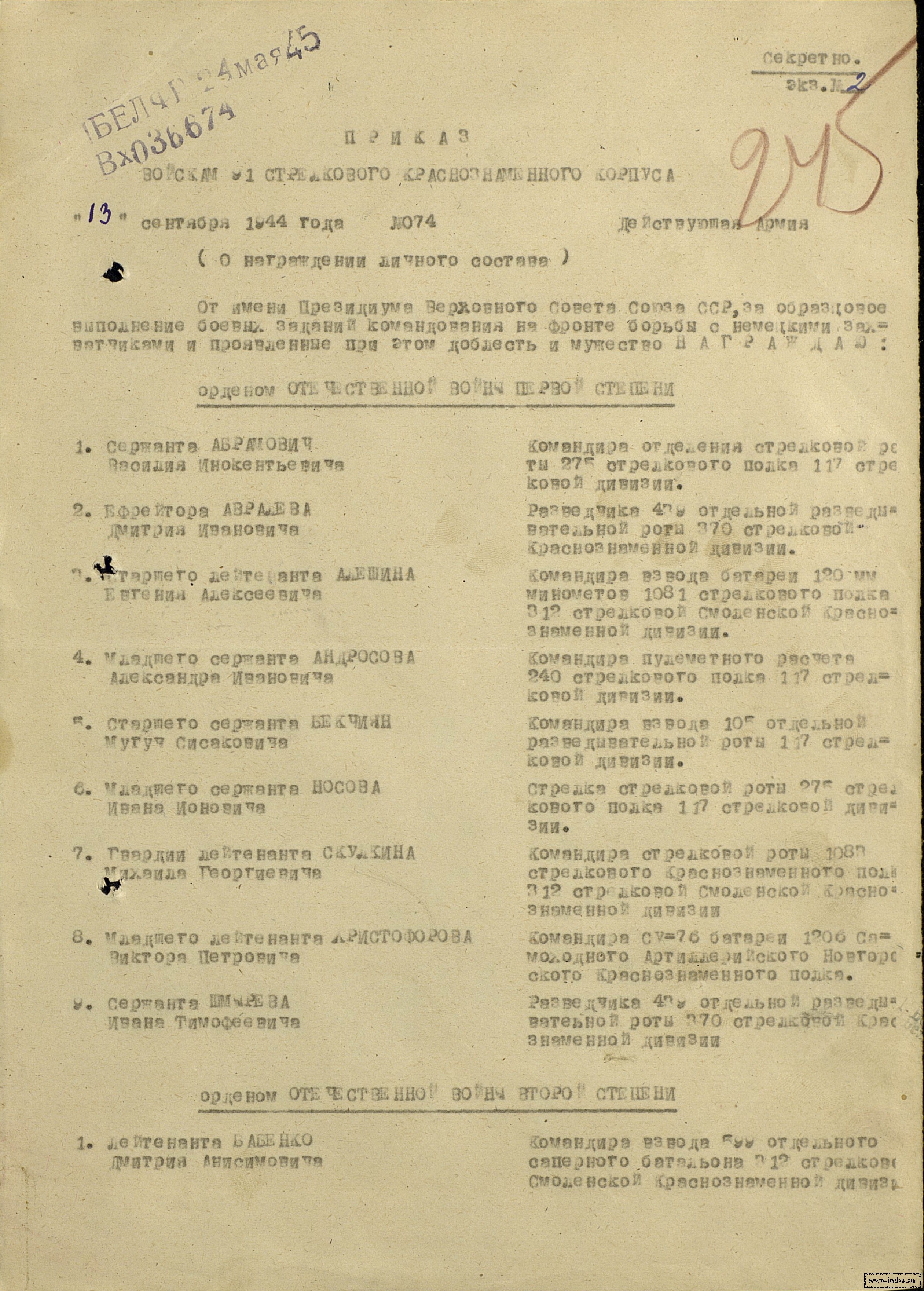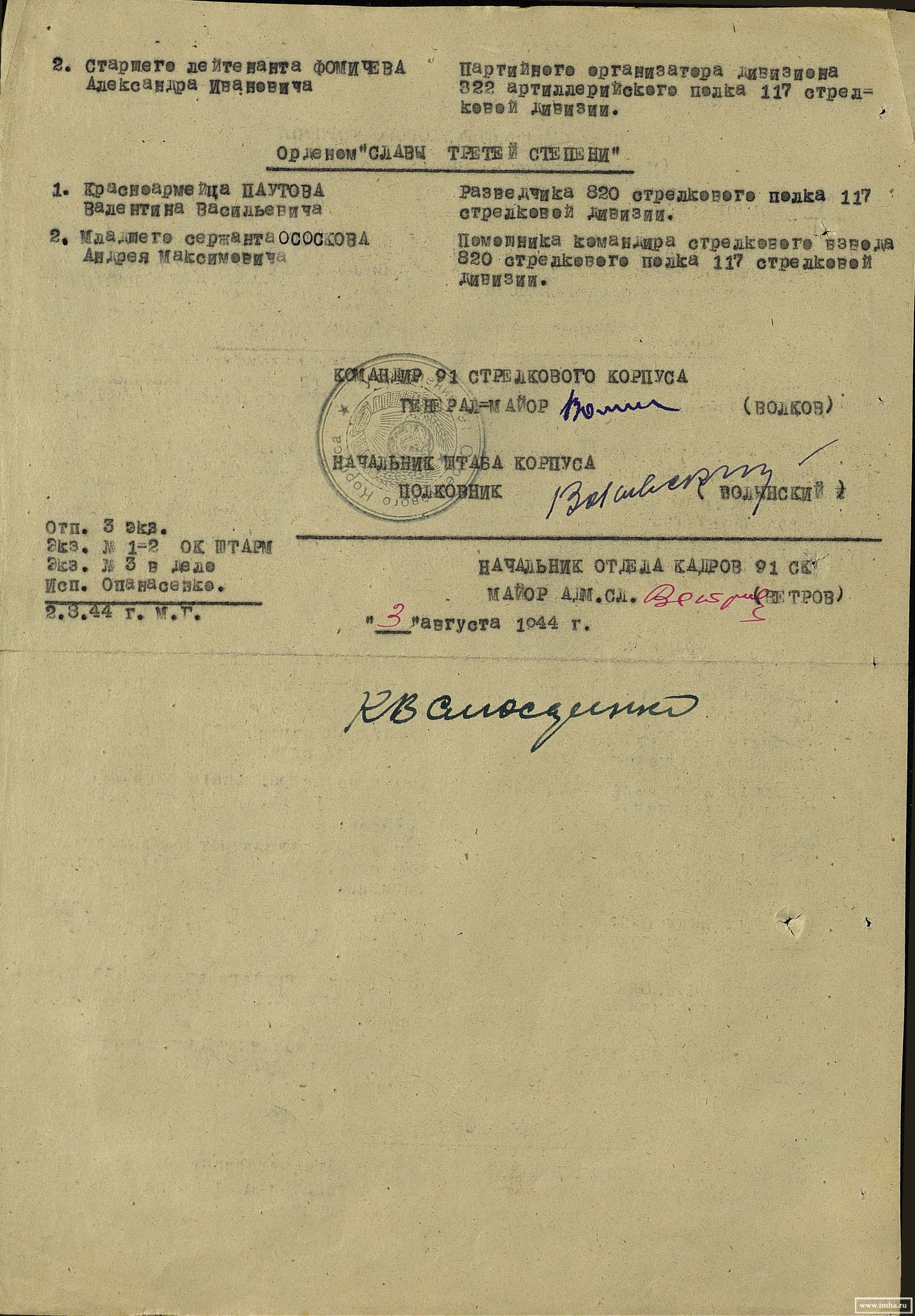 Приказ подразделения: №: 74 от: 13.09.1944.Издан: 91 ск 1 Белорусского фронта.Архив: ЦАМО,фонд: 33, опись: 690155, ед. хранения: 5131, № записи: 33535252