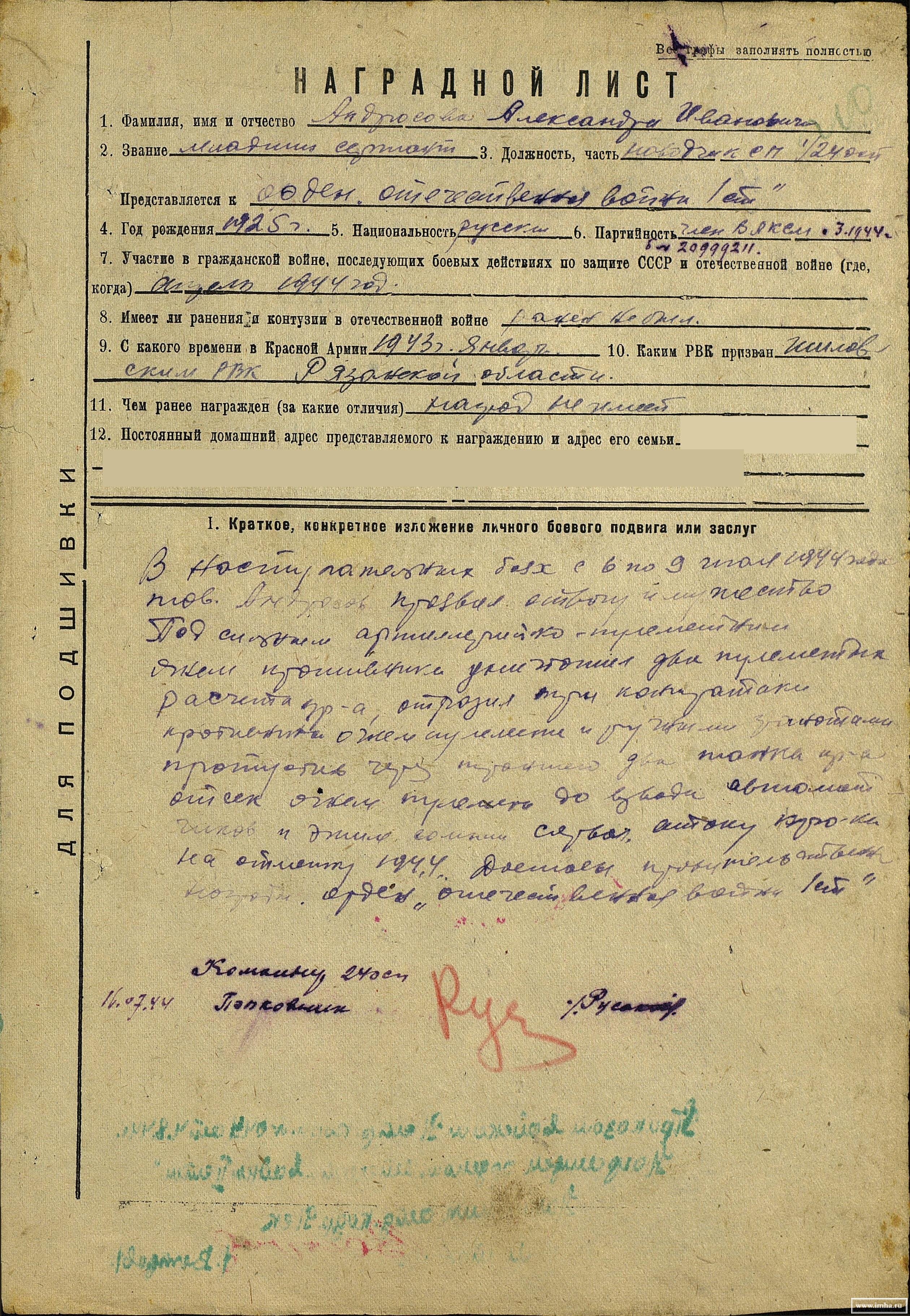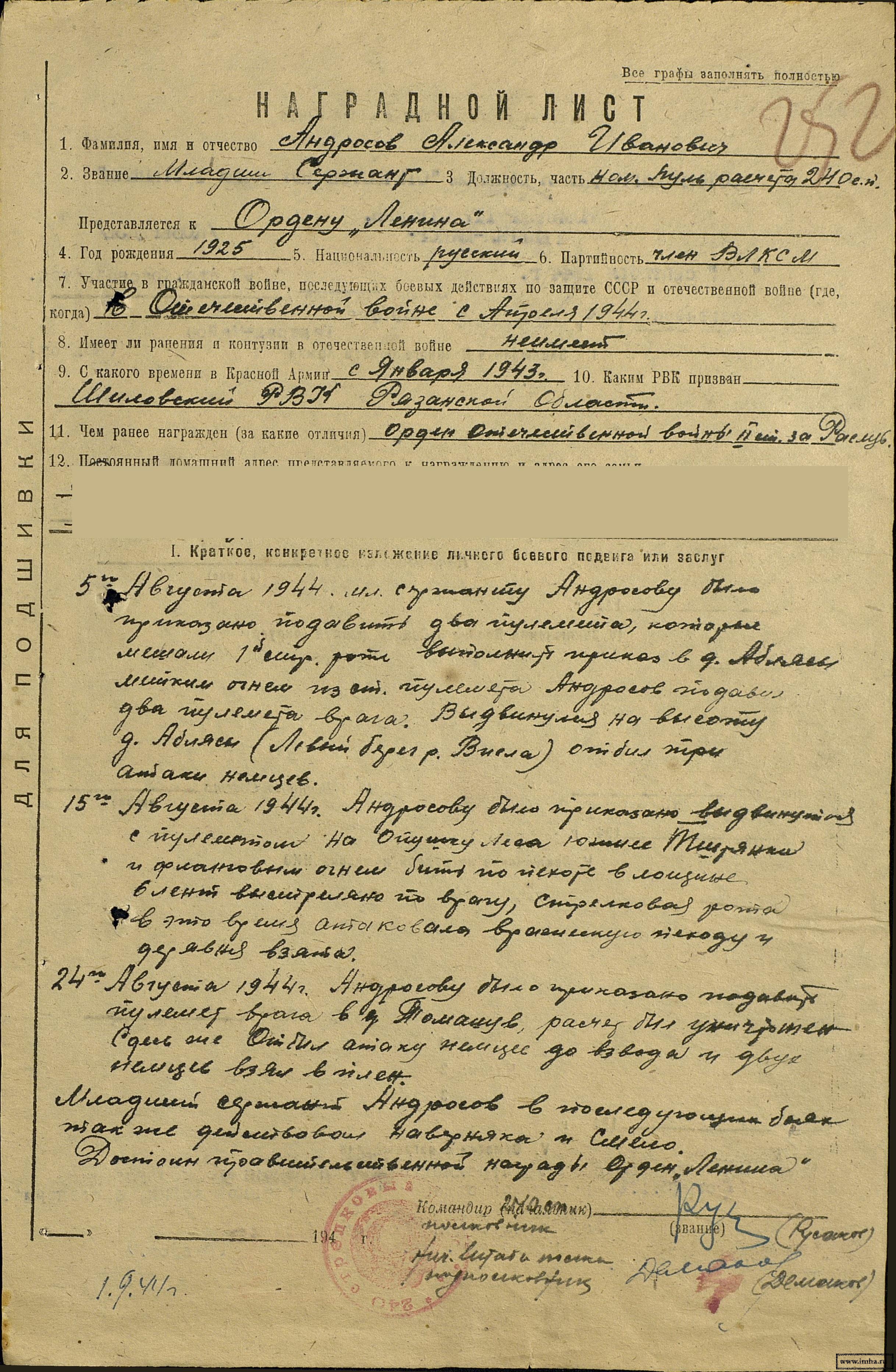 Из Наградного листа: «В наступательных боях с 6 по 9 июля 1944 г. младший сержант Андросов А.И. проявил отвагу и мужество.Под сильным артиллерийско-пулеметным огнем противника уничтожил 2 расчета врага, отразил 3 контратаки огнем пулемета и ручными гранатами. Пропустив через траншею 2 немецких танка отсек огнем своего пулемета до взвода автоматчиков, и этим самым сорвал атаку противника на отметку 194,4».