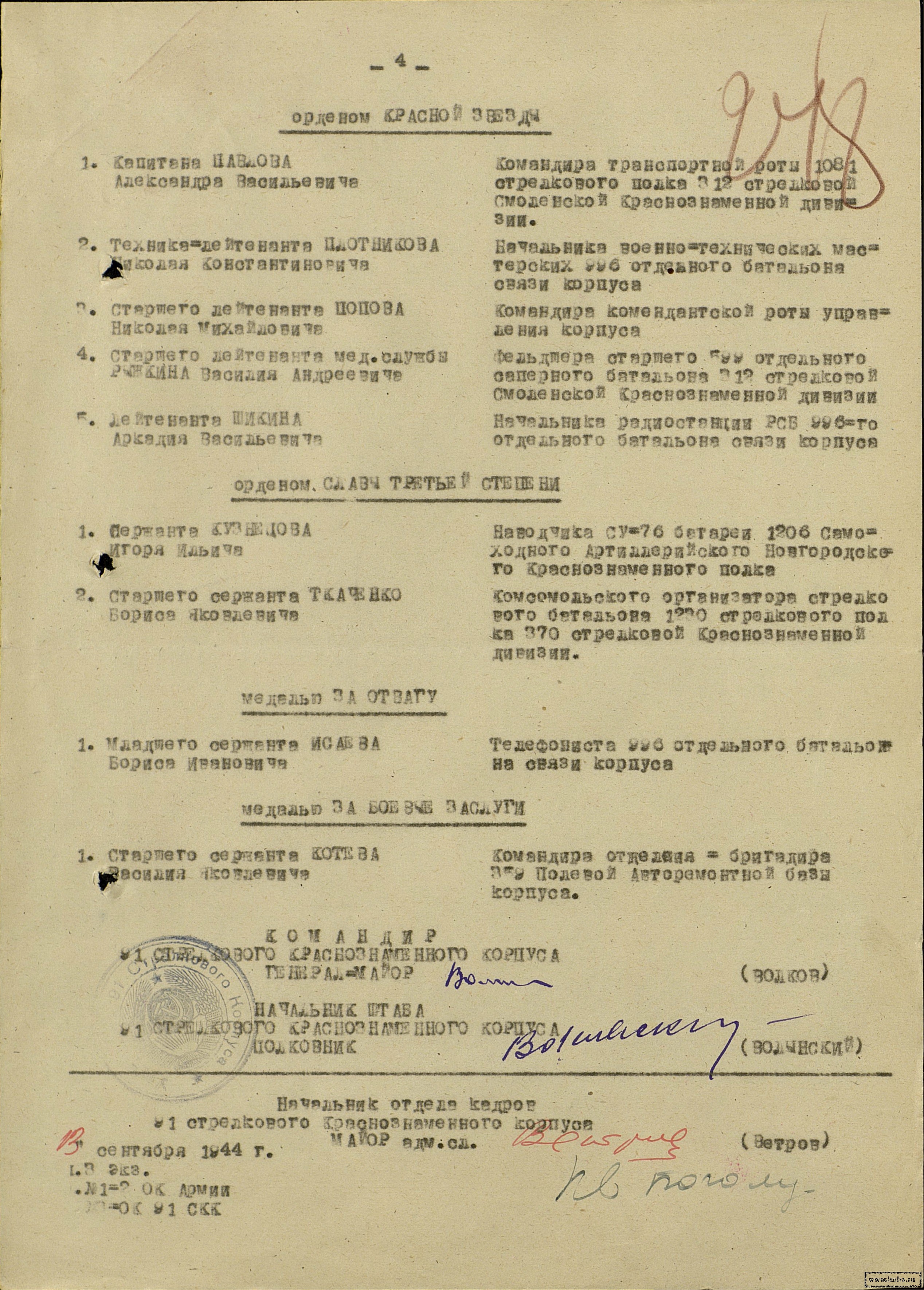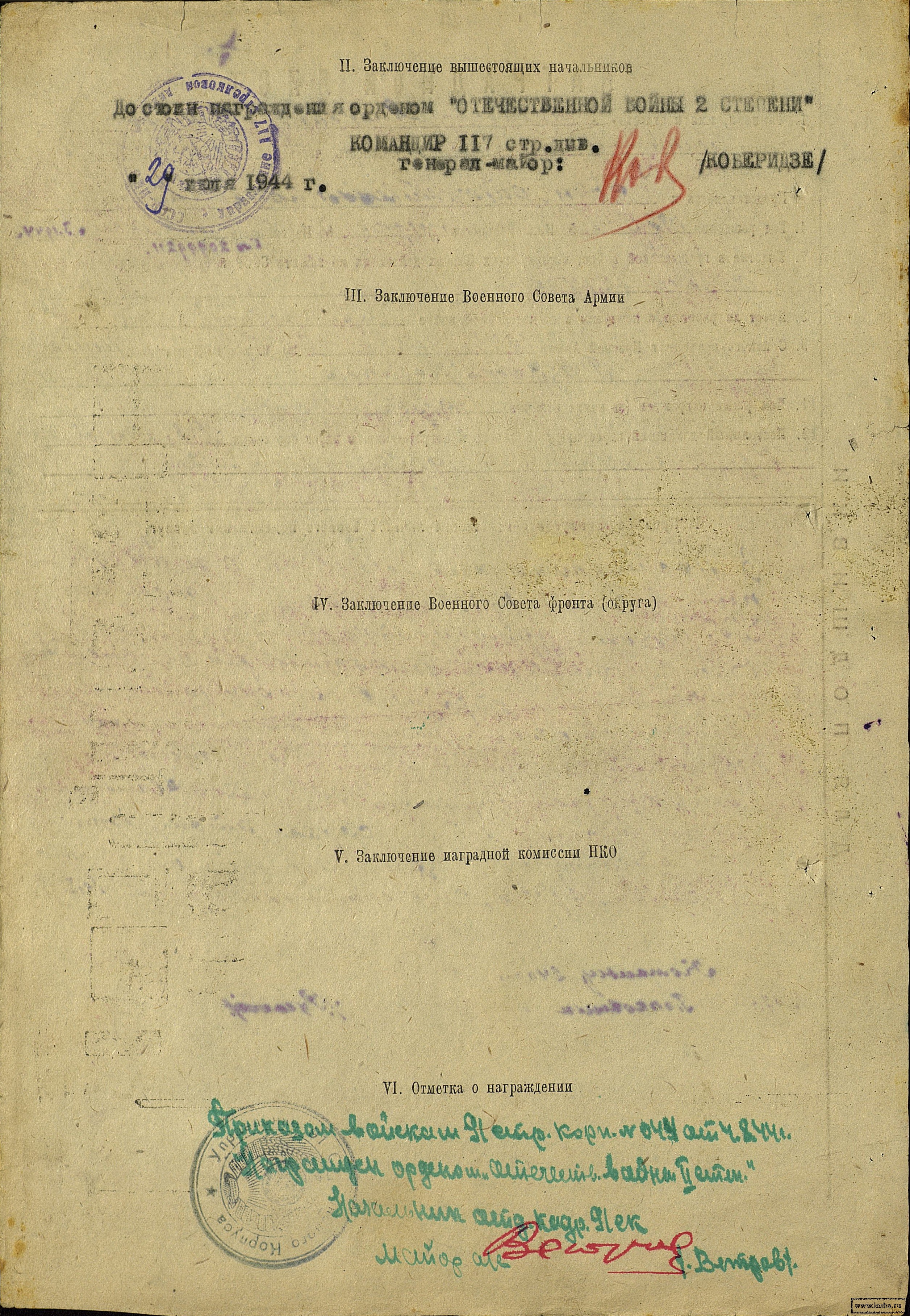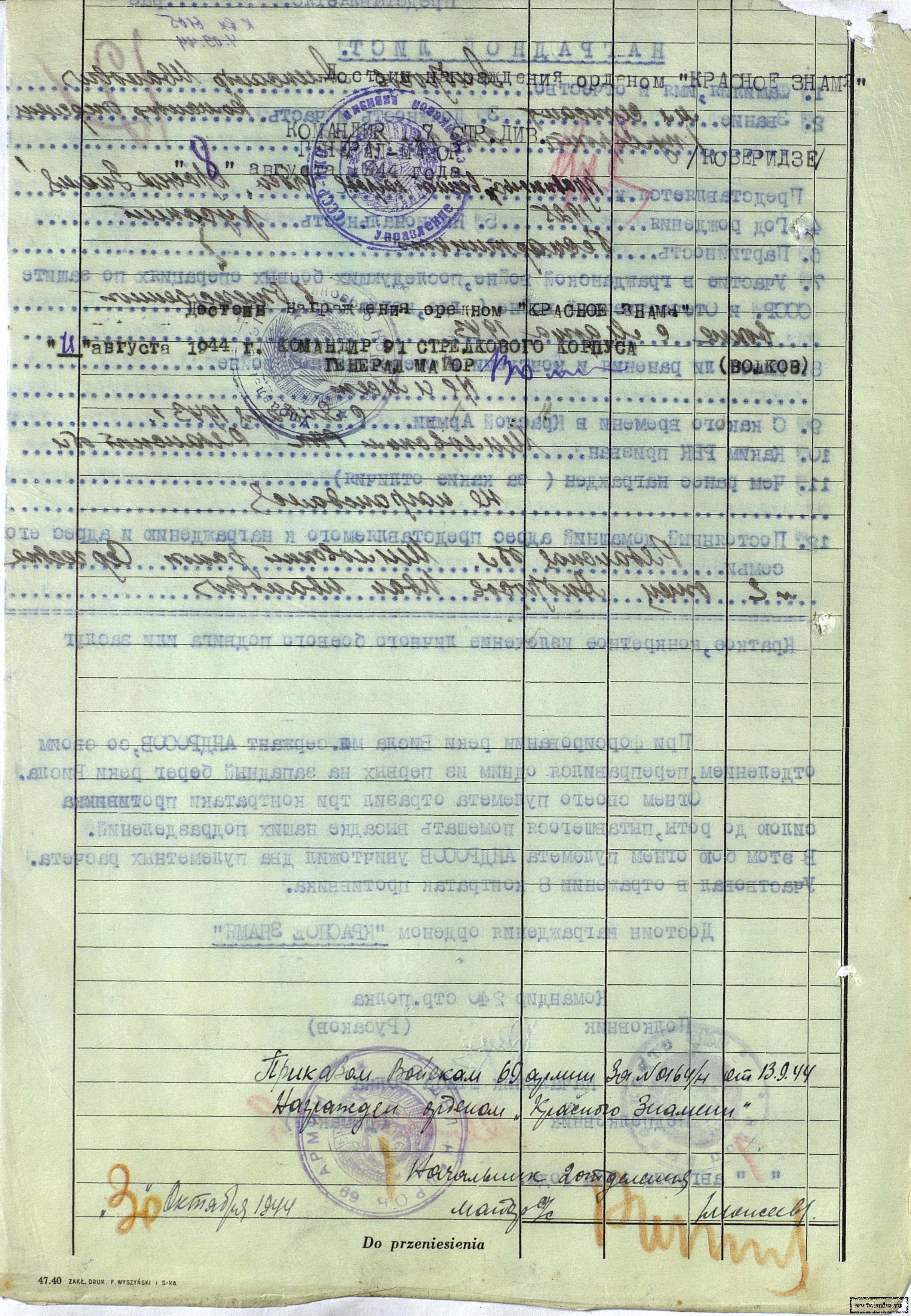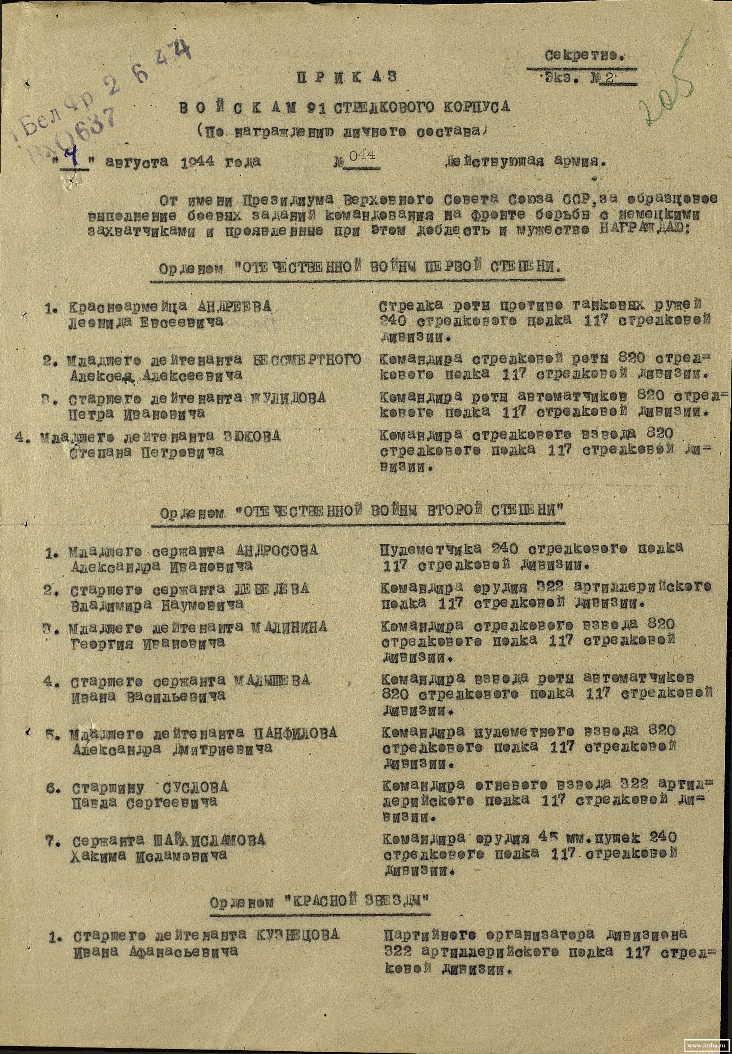 1. Приказ подразделения: №: 44 от: 04.08.1944.