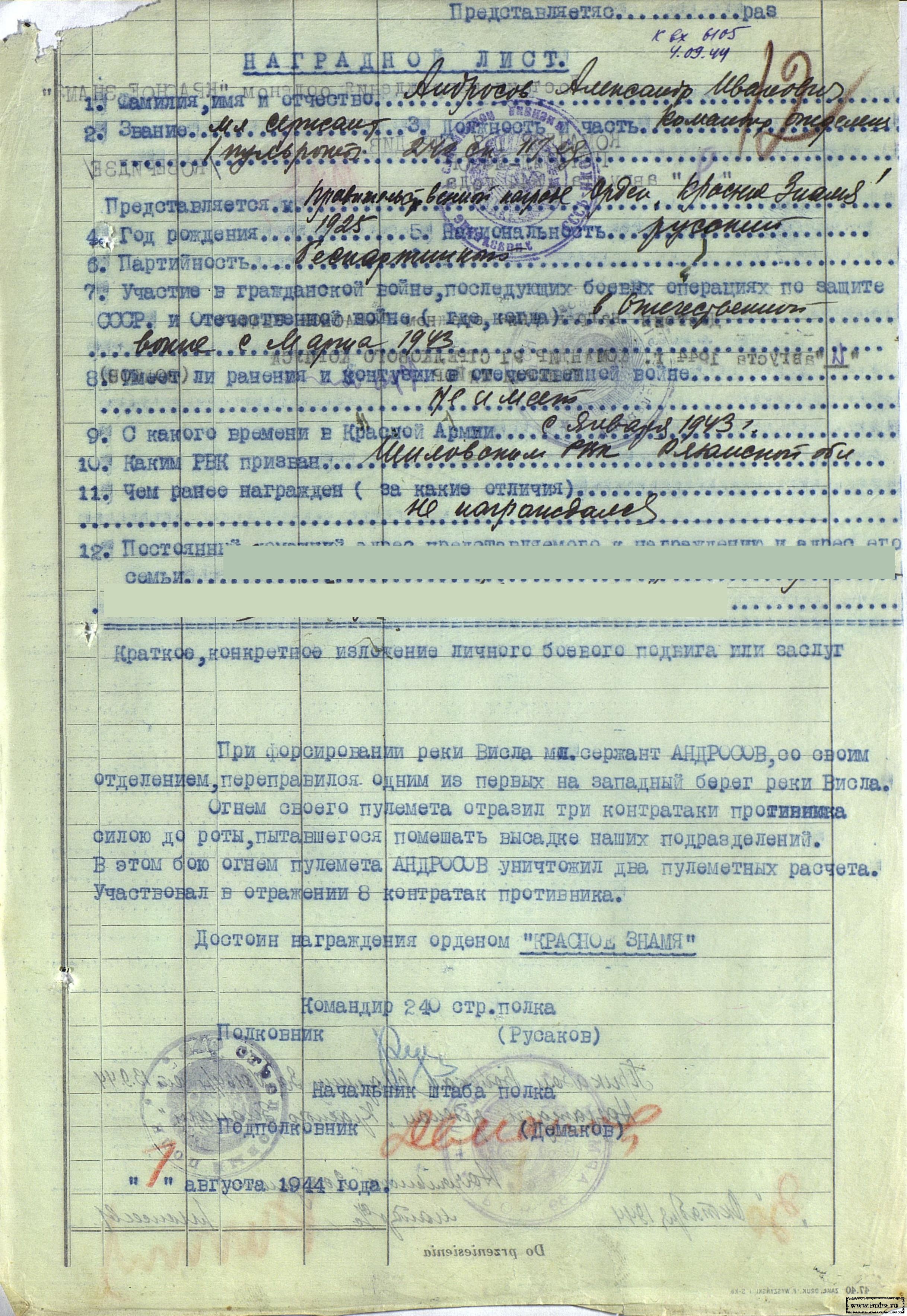 Из Наградного листа: «При форсировании реки Висла младший сержант Андросов А.И. со своим отделением переправился одним из первых на западный берег. Огнем своего пулемета отразил три атаки немцев силою до роты, пытавшимся помешать переправе наших войск.В бою Андросов А.И. уничтожил 2 пулеметных расчета и с бойцами отразил 8 атак немцев».