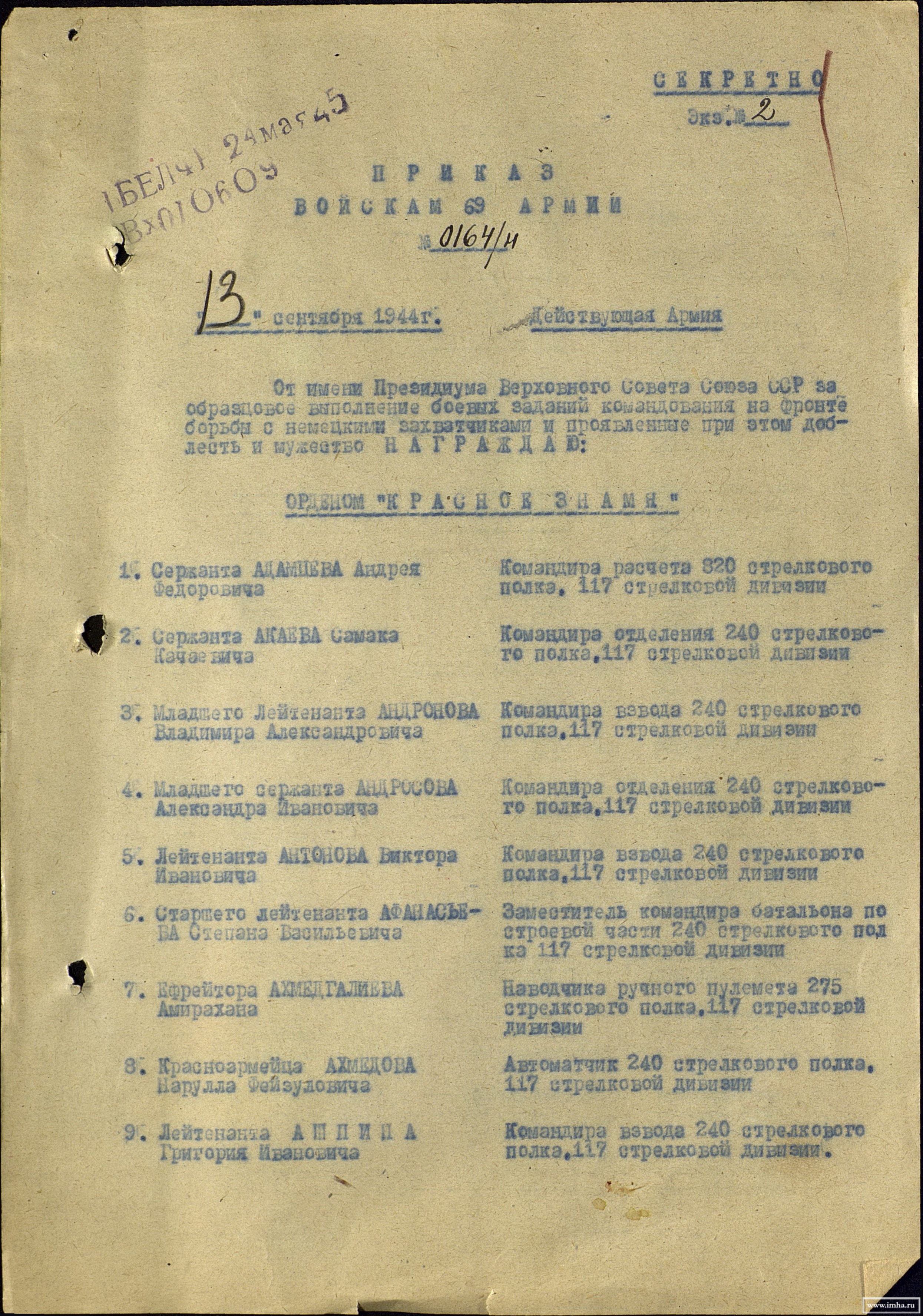 2. 13.09.1944.Орден Красного Знамени.Фронтовой приказ: №: 164/н от: 13.09.1944.Издан: ВС 69 А Архив: ЦАМО,фонд: 33, опись: 690155, ед. хранения: 5793, № записи: 35496285