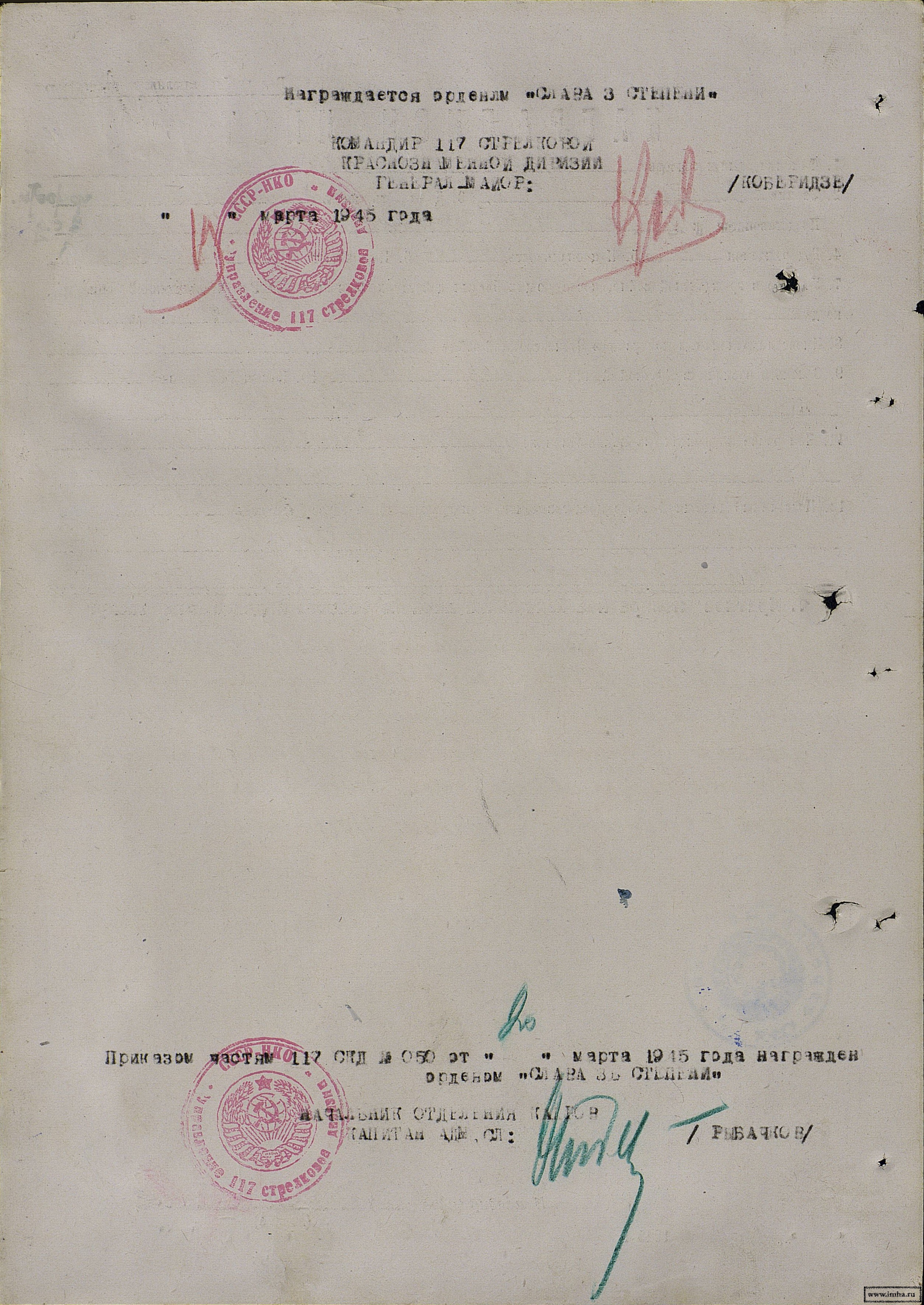 4. Приказ подразделения: №: 50 от: 20.03.1945. Издан: 117 сд. Архив: ЦАМО, фонд: 33, опись: 686196, ед. хранения: 7047, № записи: 28465056