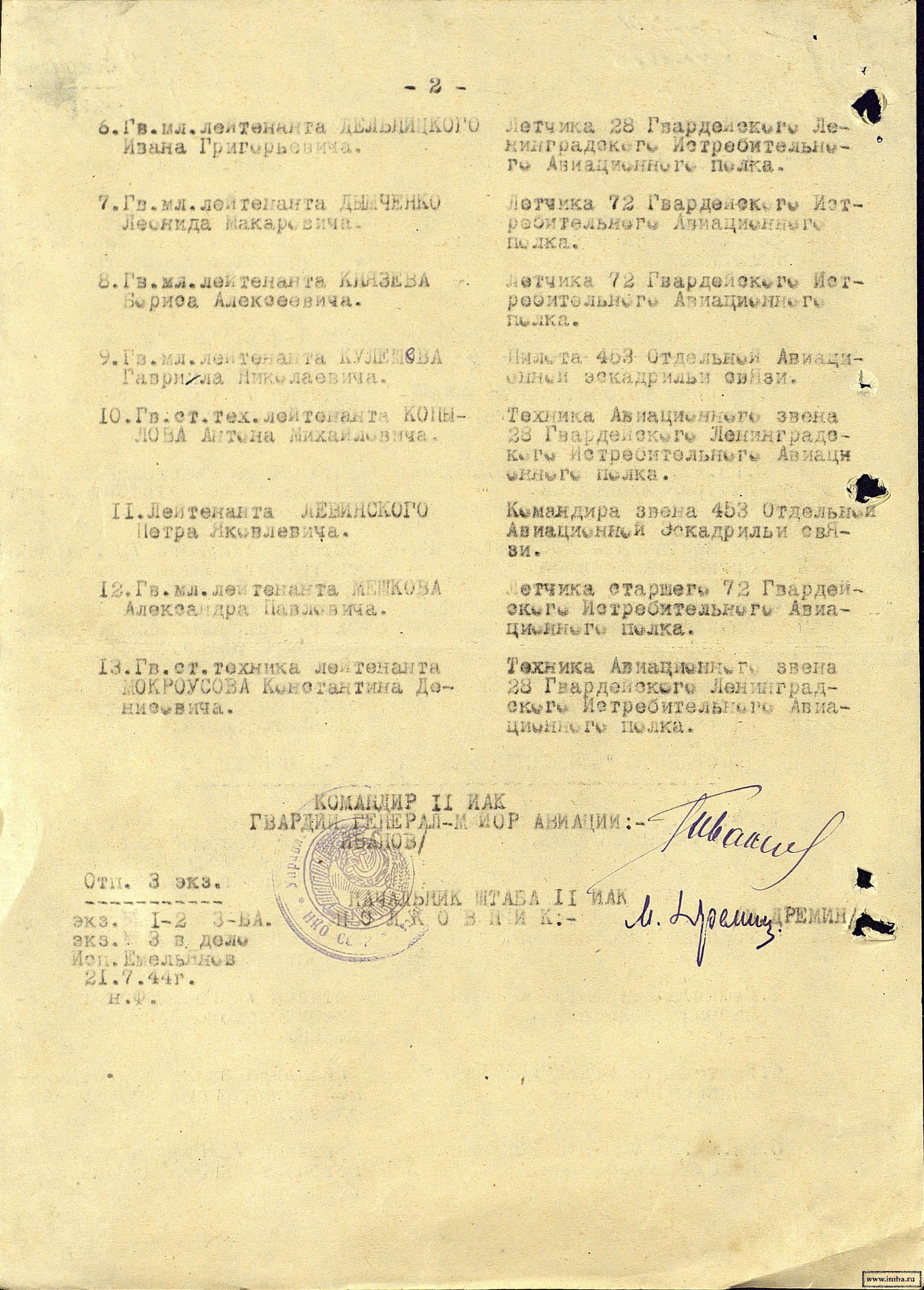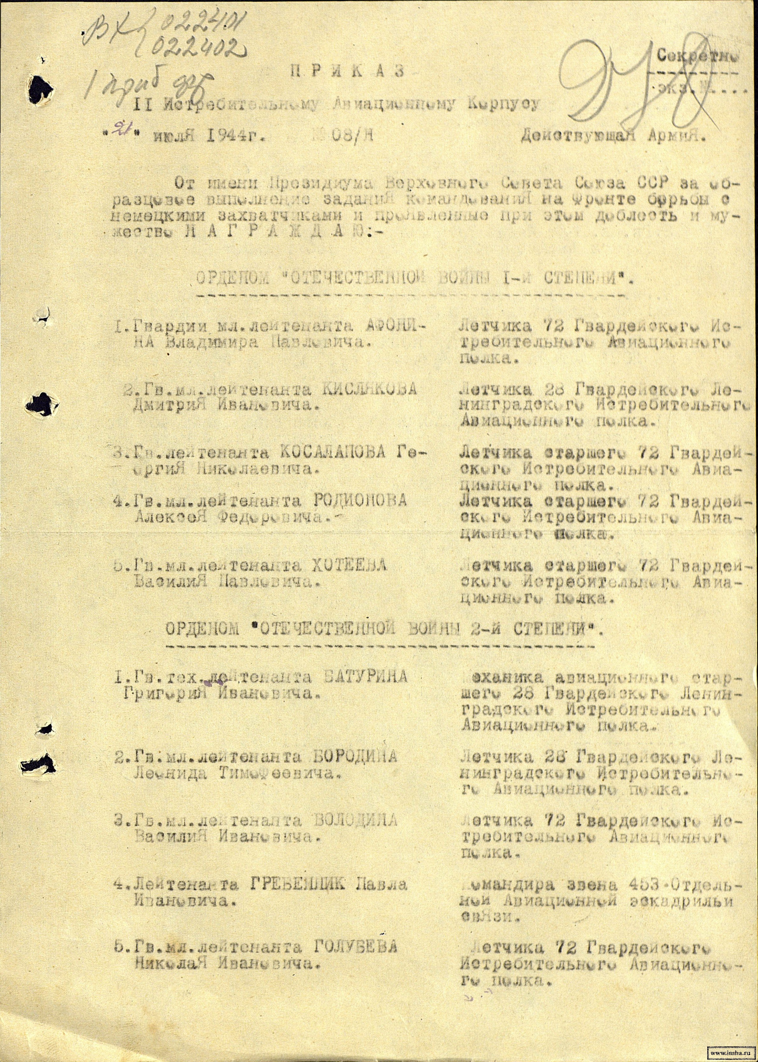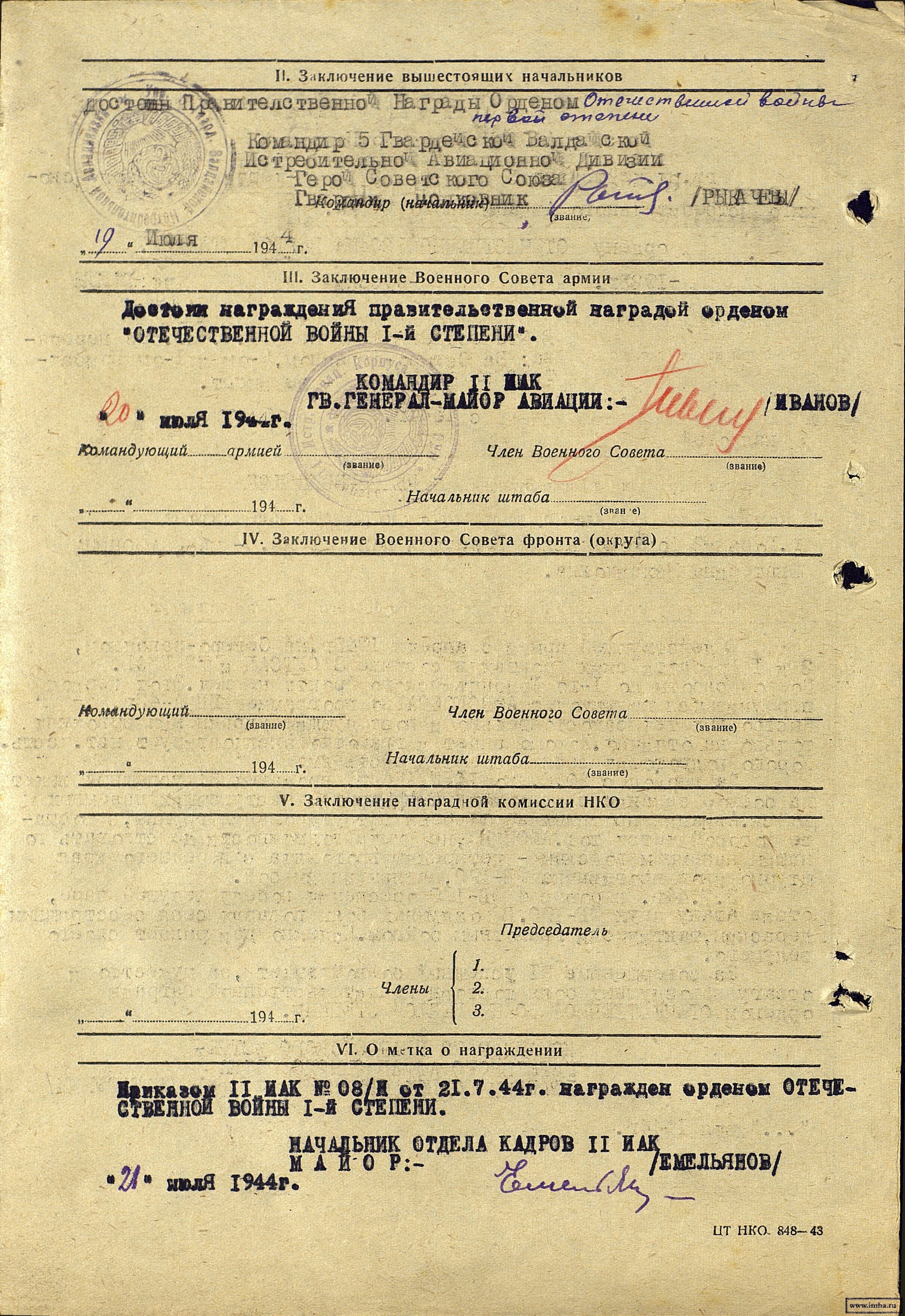 1.(Приказ подразделения:№: 8/н от: 21.07.1944.Издан: 11 иак / Архив: ЦАМО,фонд: 33,опись: 686044,ед. хранения: 3871,№ записи: 21232689).