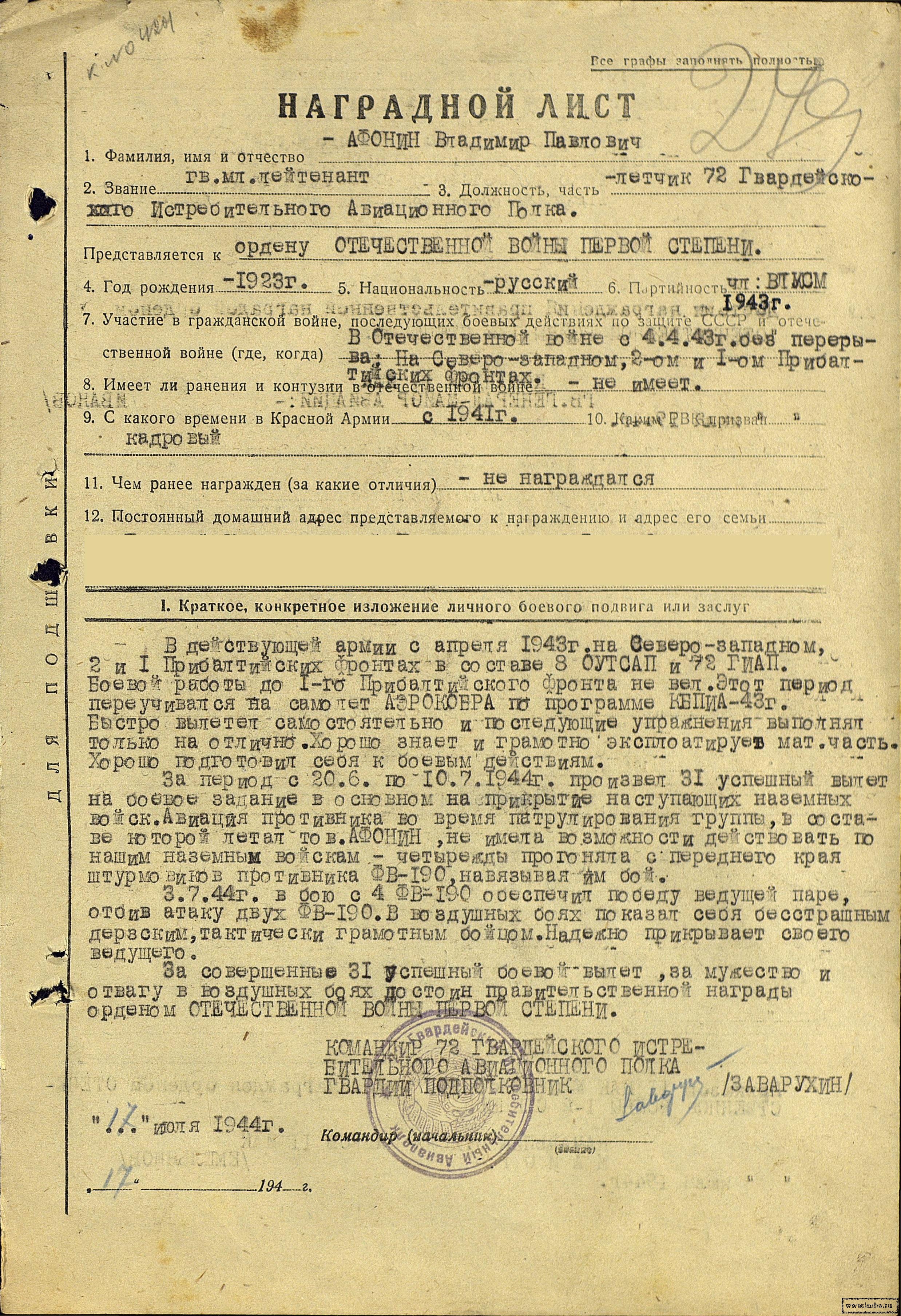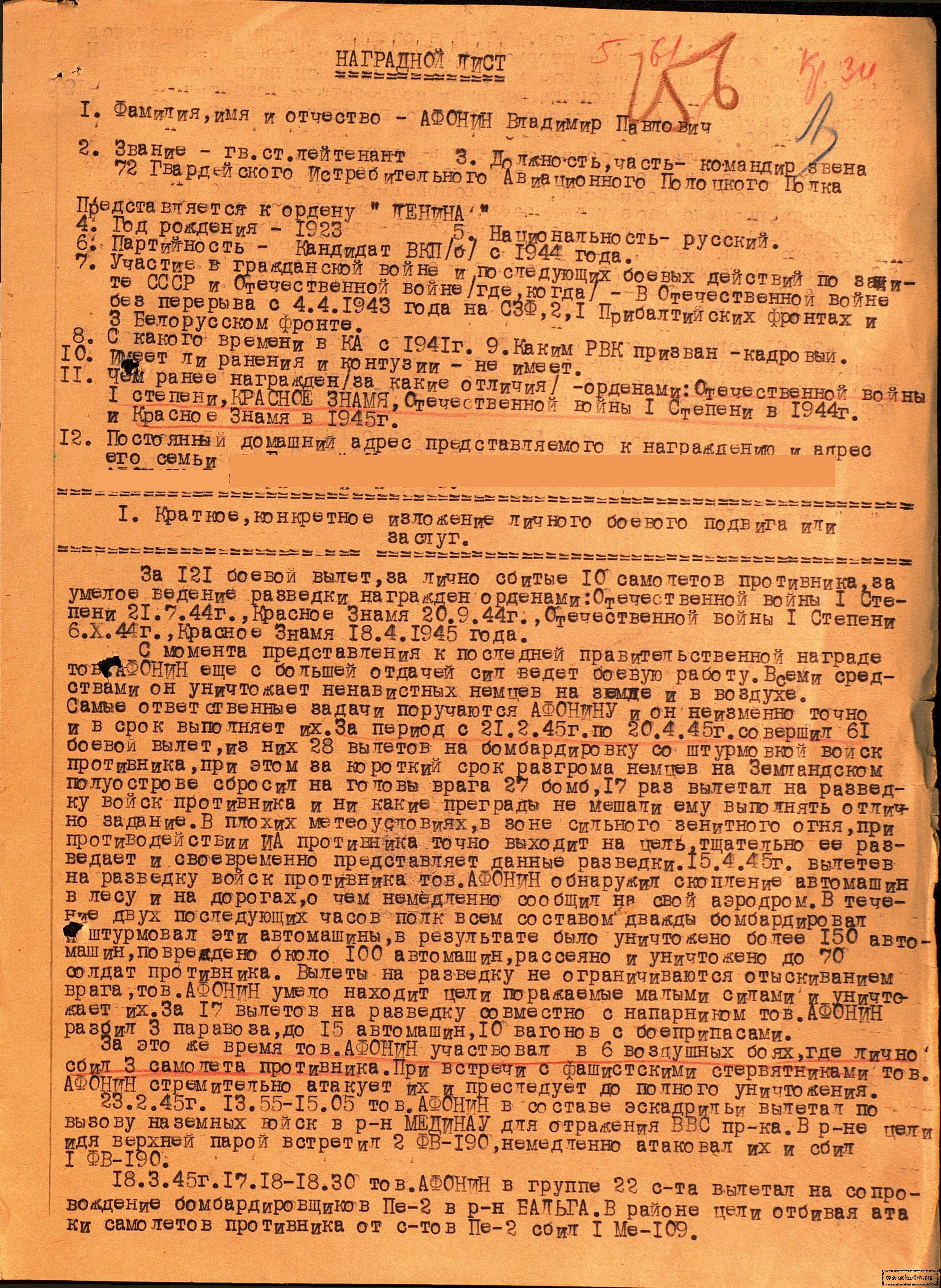 Из Наградного листа: «За 121 боевой вылет,за лично сбитые 10 самолетов….