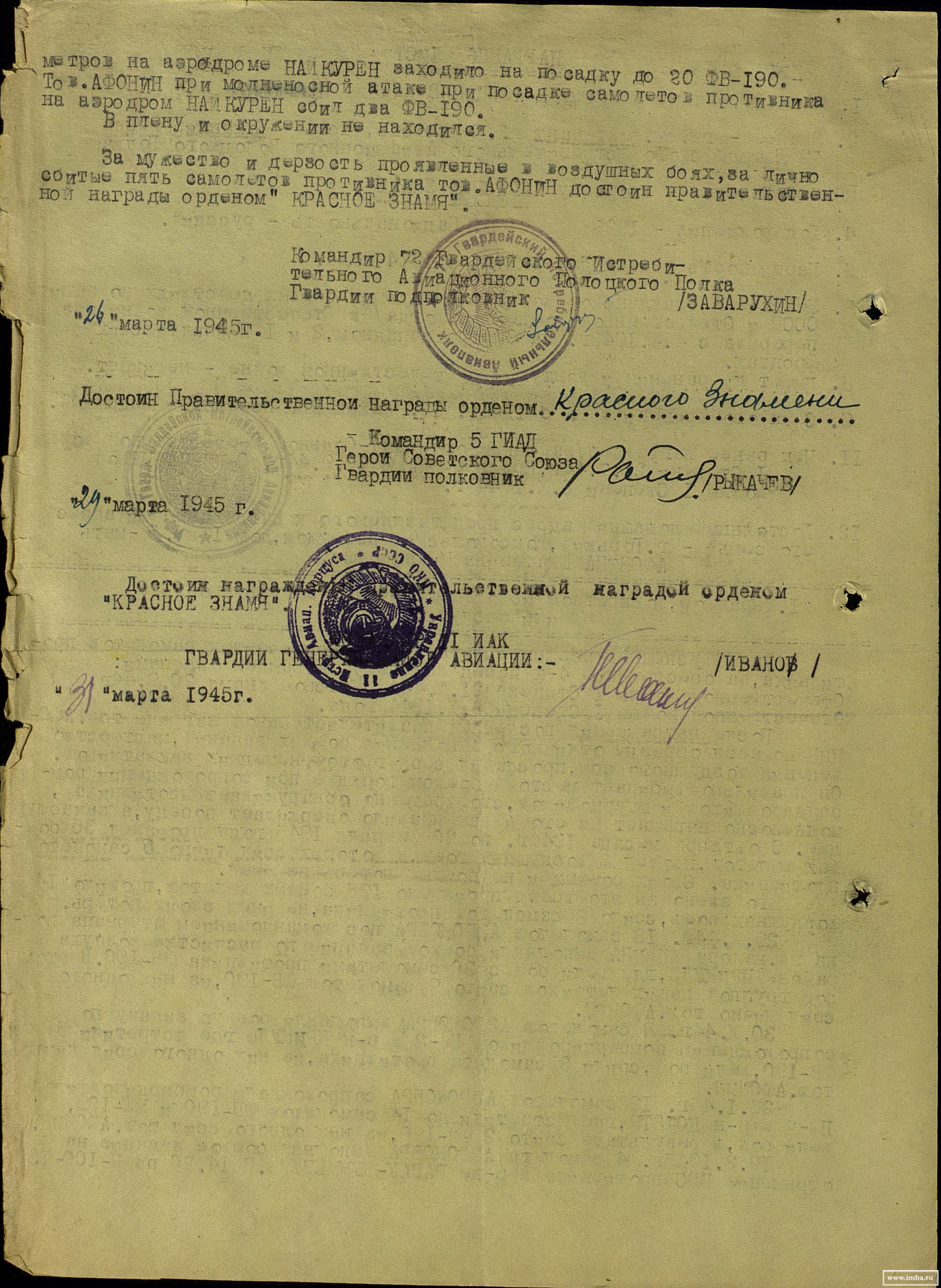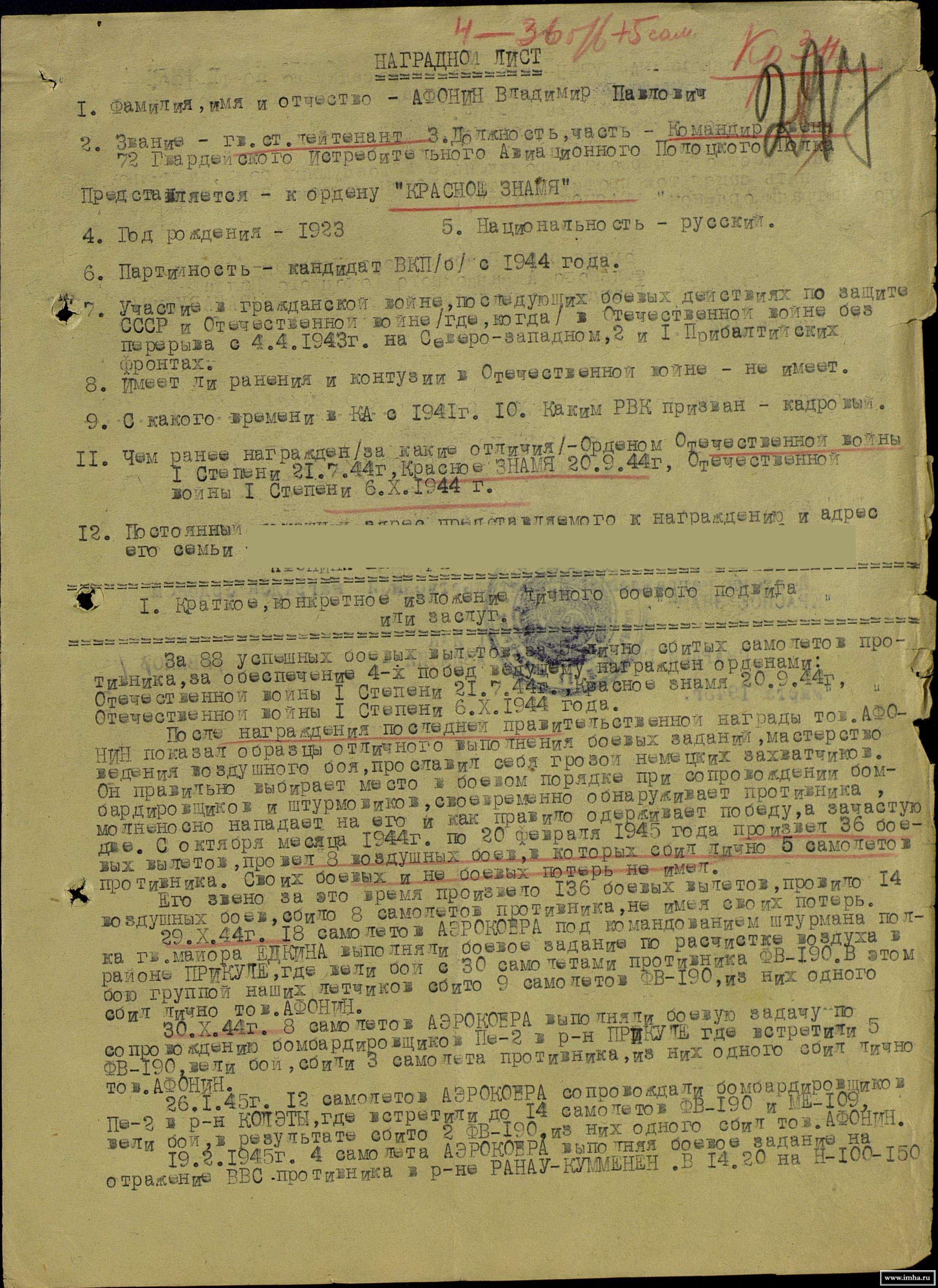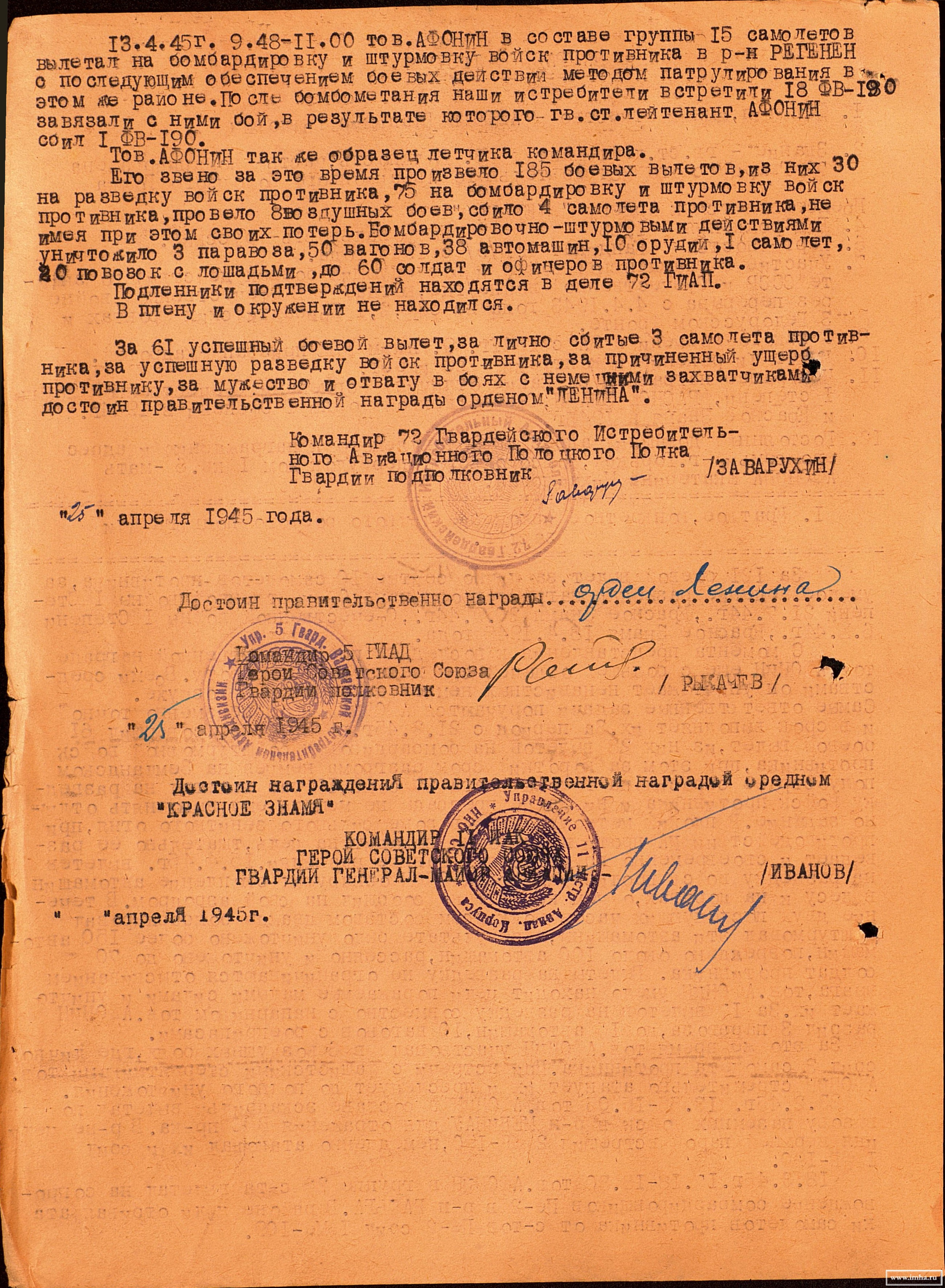 Из Нагр.листа: «С 11.7.1944г. по 28.8.1944г. совершил 35 успешных боевых вылетов, из них 7 на разведку войск противника, где показал преданность Родине, мастерство летчика, мужество и отвагу русского воина.В плохую погоду в зонах сильного зенитного огня при активности ИА противника надежным прикрытием ведущего, обеспечивает ему тщательное изучение противника. В результате разведка всегда успешная и экипажи доставляют ценные свдения о противнике. За это же время тов.Афонин участвовал в 11 воздушных боях,лично сбил самолет противника ФВ-190. Участник известных боев 10 Аэрокобр против 40 ФВ-190 и 24 против 50. 27 июля 1944г. 18 Аэрокобр сопровождали 20 ТУ-2 в район Митава.На 2 группы ТУ-2 и 10 Аэрокобр напали до 40 ФВ-190. Тов.Афонин не только не допустил к своей группе противника, но и обеспечил победу ведущему, отсекая атаки 4-х ФВ-190. 17 июля 1944 г. при сопровождении бомбардировщиков в район Митавы на обратном маршруте к бомбардировщикам пытались прорваться 4 ФВ-190, отсекать их ринулся т.Афонин, во время отогнал противника от ТУ-2, и в коротком преследовании вогнал в землю одного из фашистских стервятников».