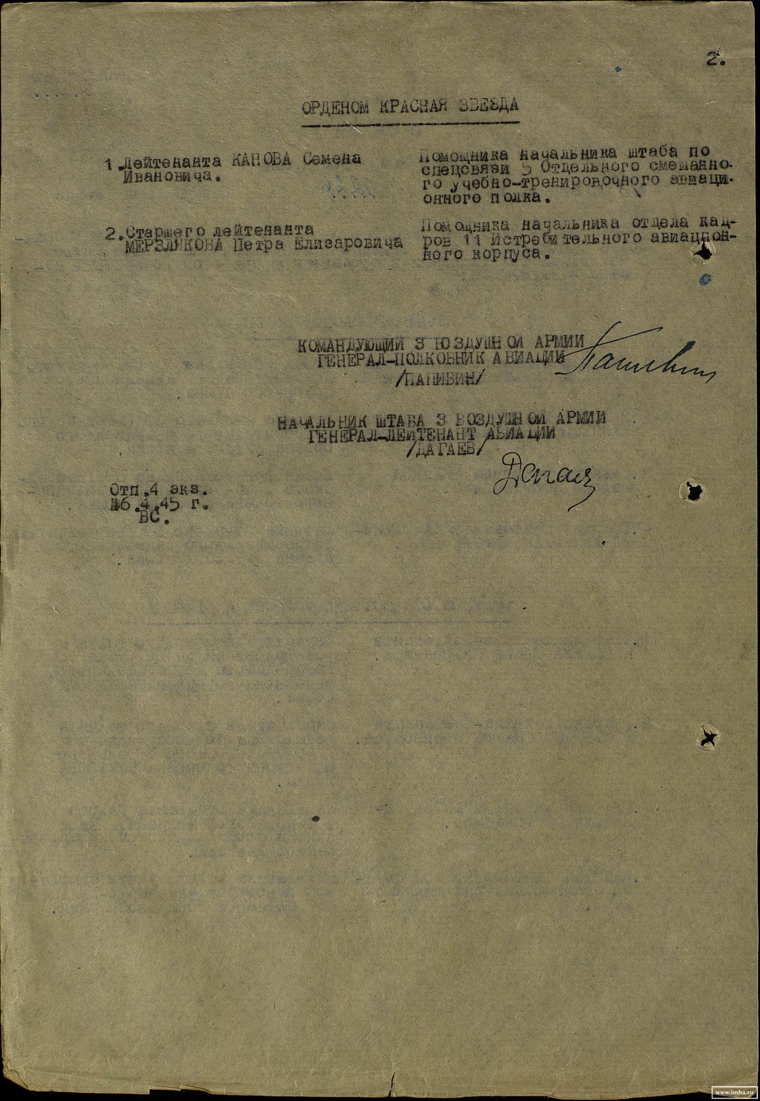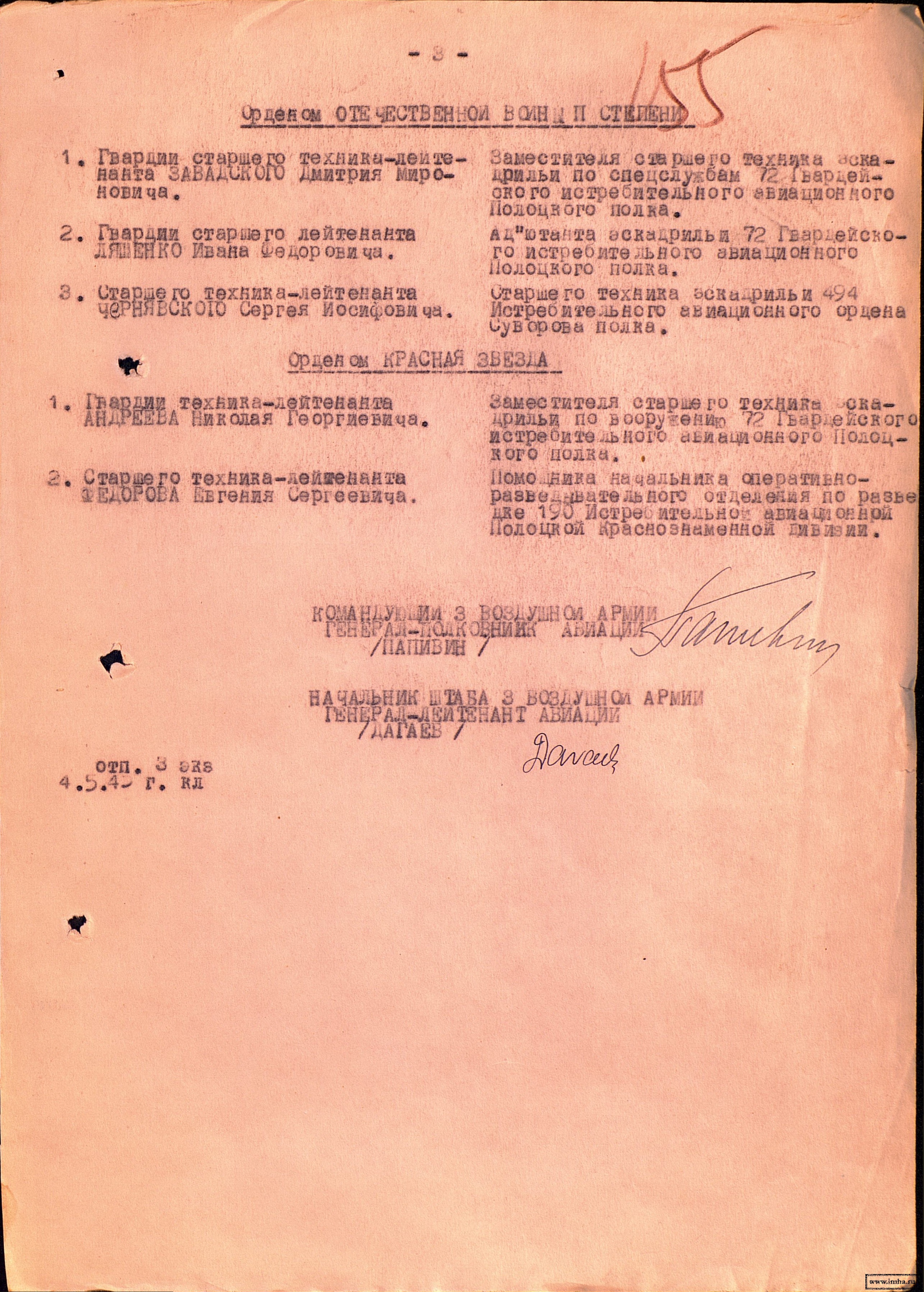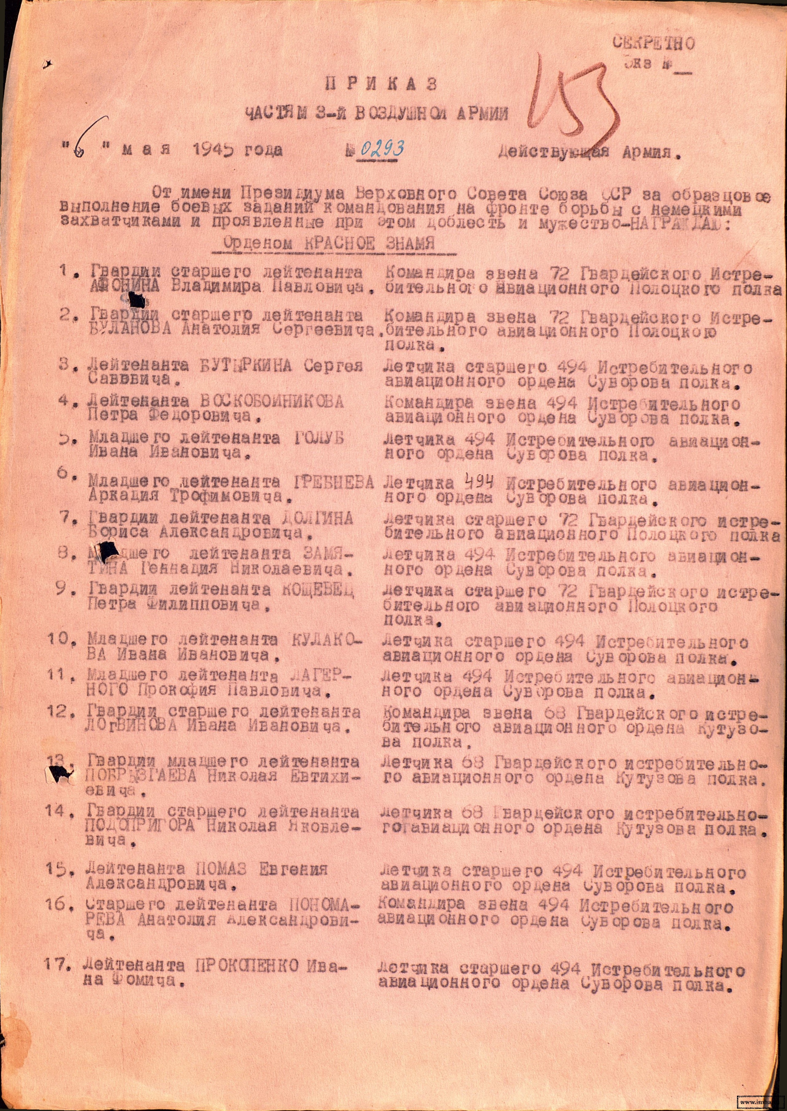 5.(Фронтовой приказ:№: 293 от: 06.05.1945.Издан: ВС 3 ВА. Архив: ЦАМО,фонд: 33,опись: 686196,ед.хранения: 3342,№ записи: 2549453).