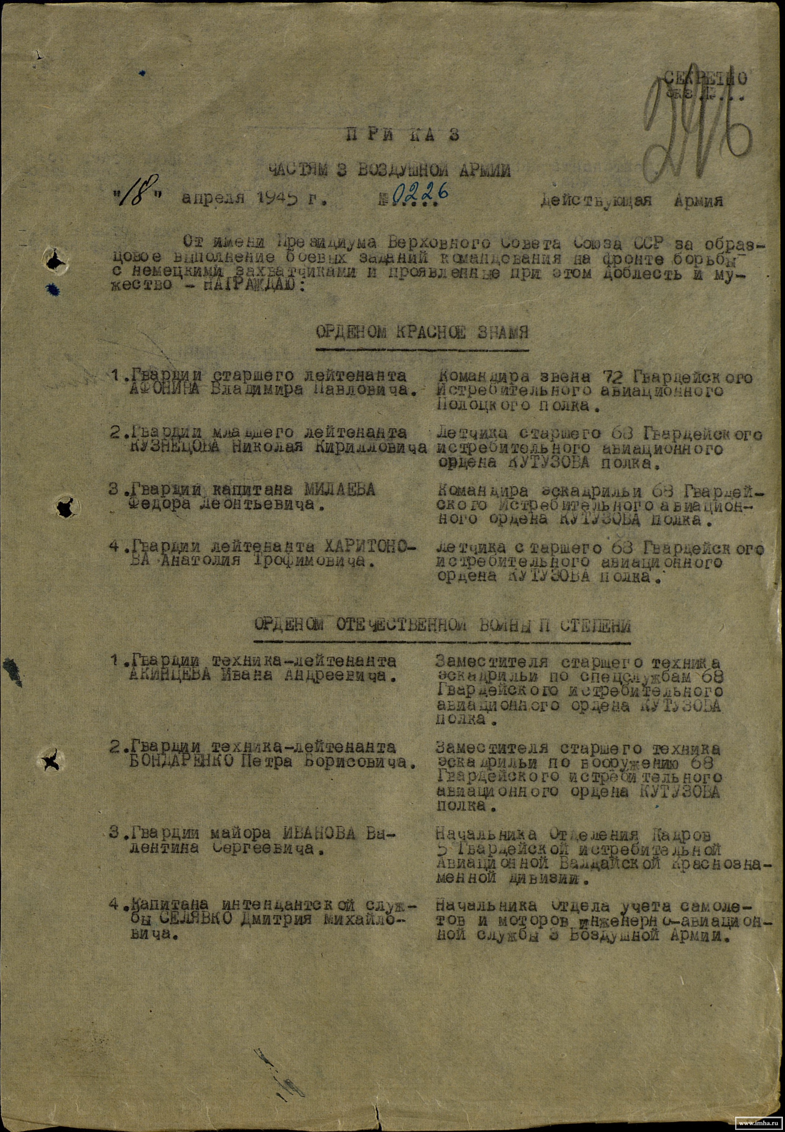 4.226.18.04.1945.Орден Красного Знамени.(Фронтовой приказ:№: 226 от: 18.04.1945.Издан: ВС 3 ВА. Архив: ЦАМО,фонд: 33,опись: 686196,ед.хранения: 7361,№ записи: 29534594).