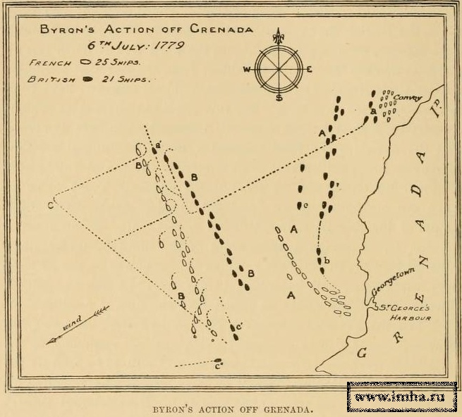 Байрон подошел к Гренаде на рассвете 6 июля, не подозревая, что о-в за день до этого сдался французам. Часть французского судового десанта только что возвратилась на свои суда; эскадра д’Эстенга, стоявшая на якоре у г. Джорджтоун, на юго-западном берегу о-ва, и предупрежденная накануне о приближении английского флота, начала в 4 часов утра поспешно сниматься с якоря.