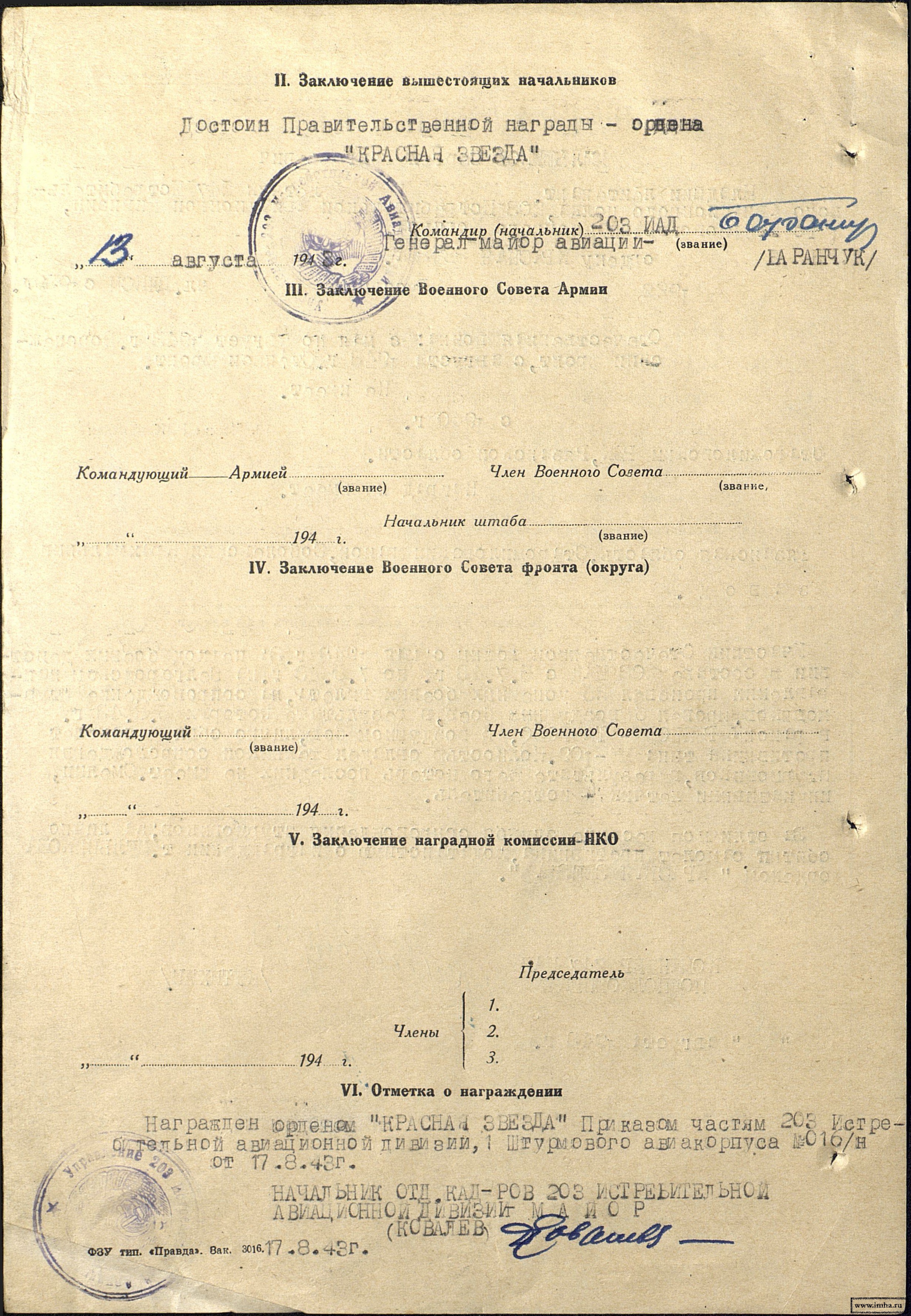 1.16/н.17.08.1943.Орден Красной Звезды. (Приказ подразделения №: 16/н от: 17.08.1943. Издан: 203 иад.Архив: ЦАМО,фонд: 33,опись: 686044,ед.хранения: 25,№ записи: 21070288).
