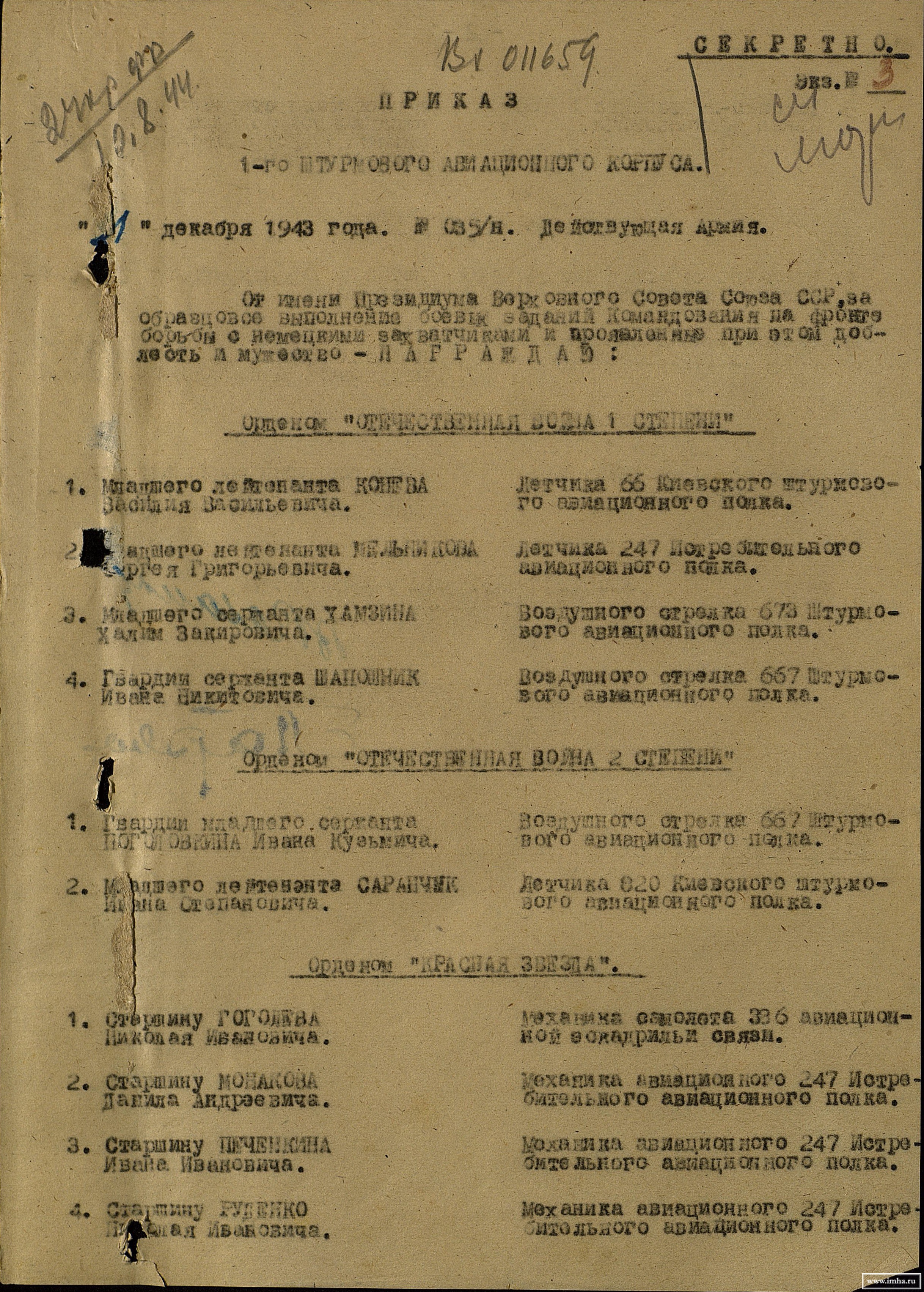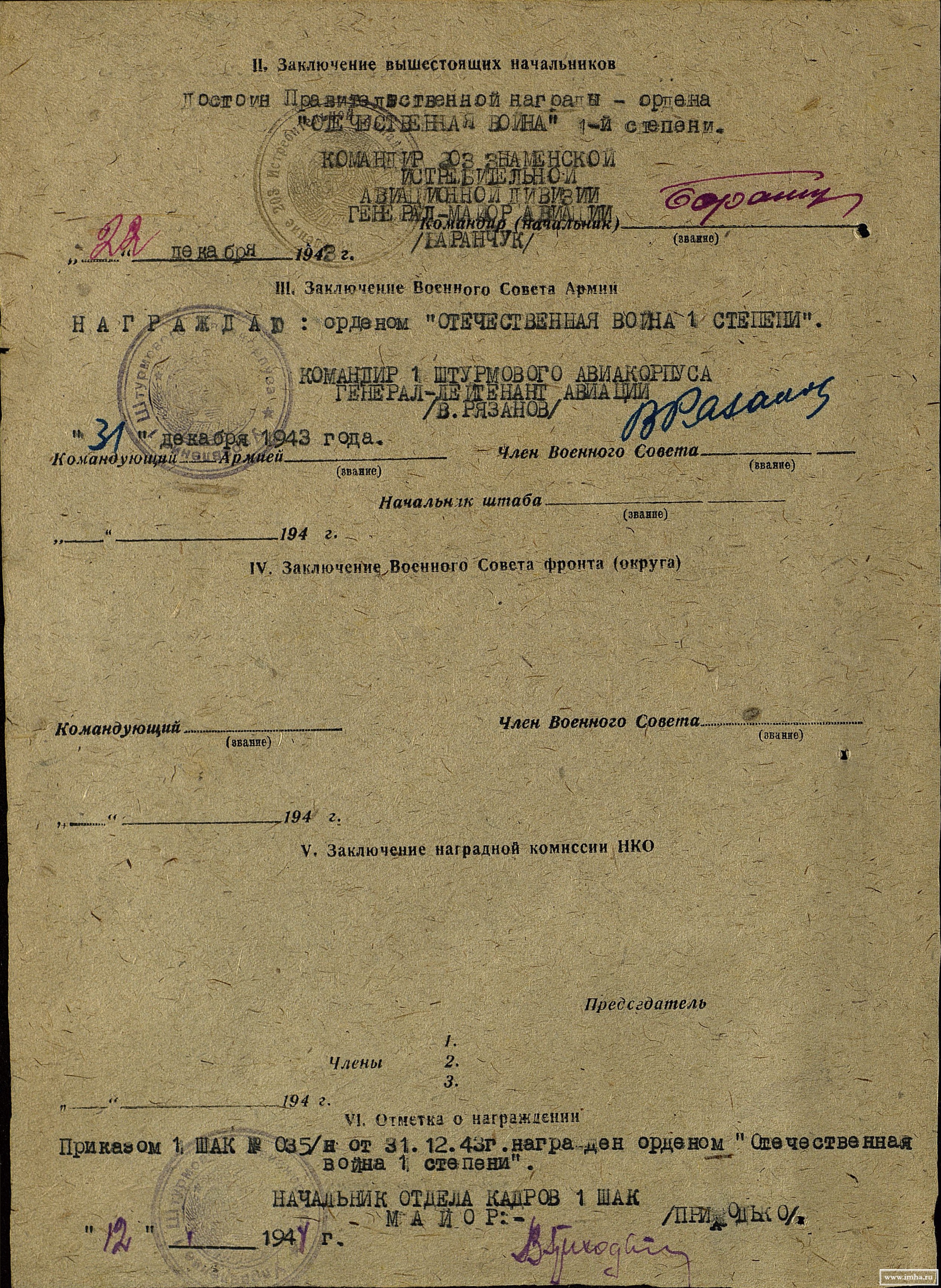 2.35/н.31.12.1943.Орден Отечественной войны I степени. (Приказ подразделения №: 35/н от: 31.12.1943.Издан: 1 шак.Архив: ЦАМО,фонд: 33,опись: 686044,ед.хранения: 3979,№ записи: 20135282).