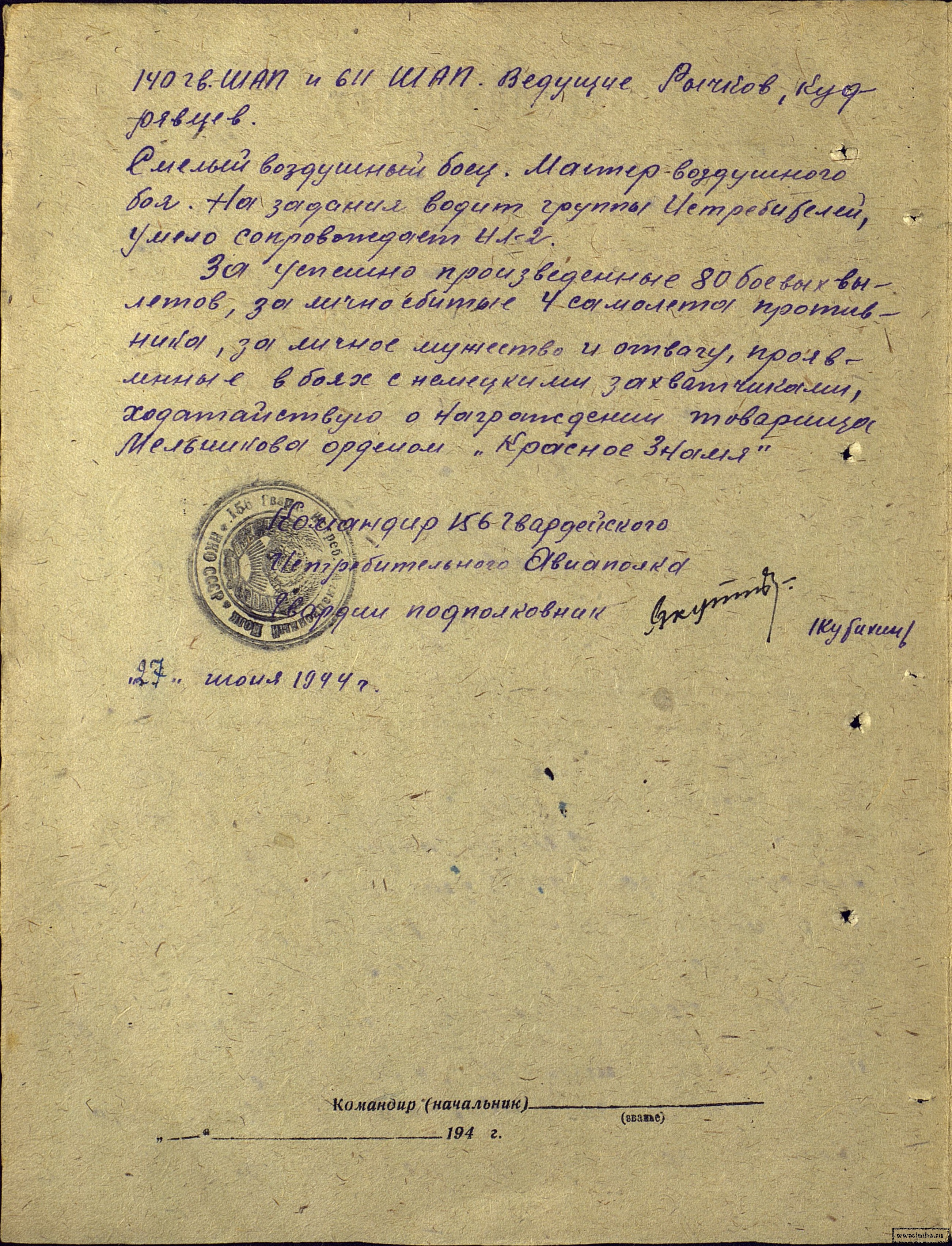 Потерь штурмовиков от воздушного противника не имеет. Отличный ведущий пары. Умело сопровождает штурмовиков. Обеспечивая им возможность выполнить боевую задачу».