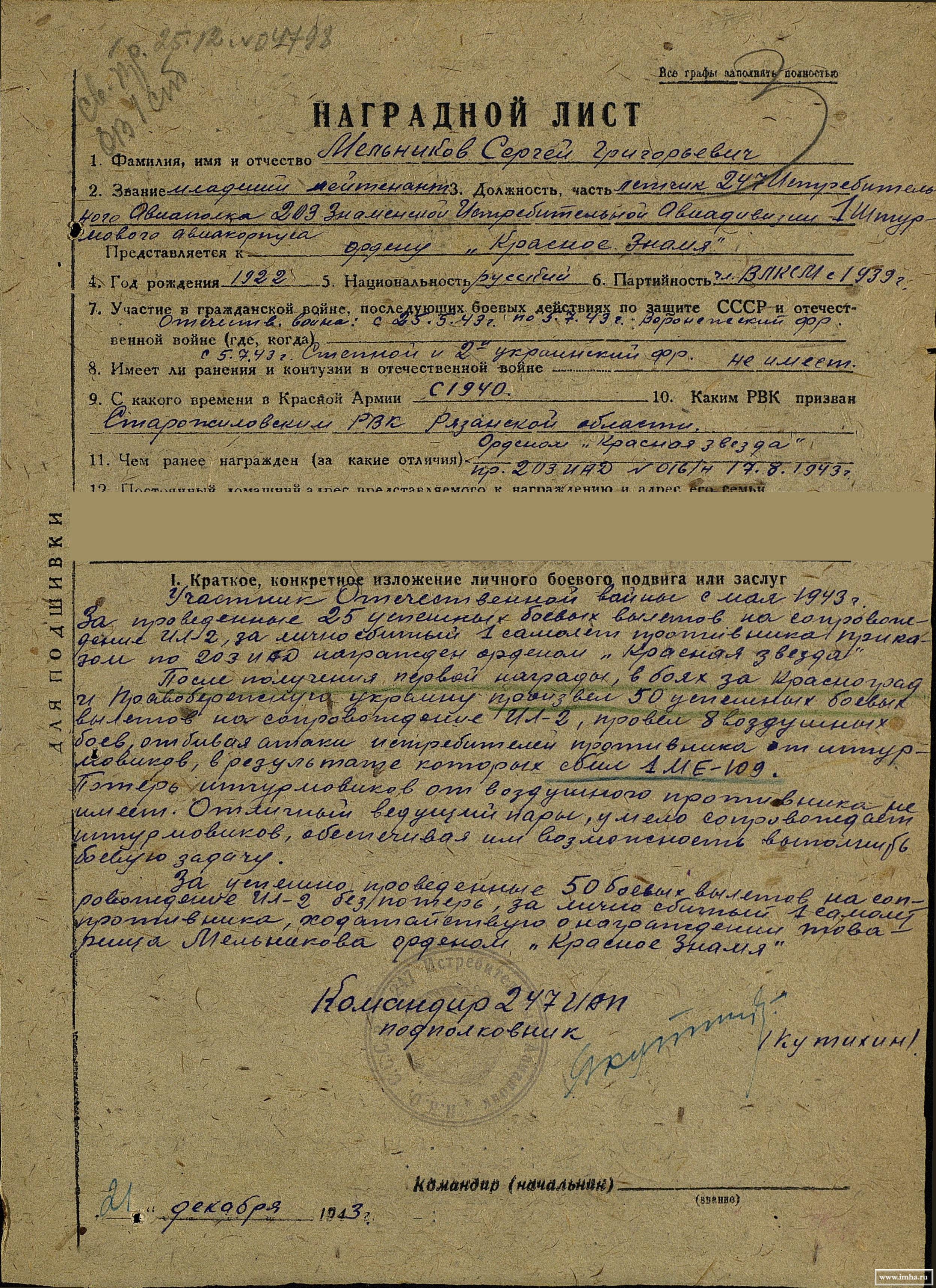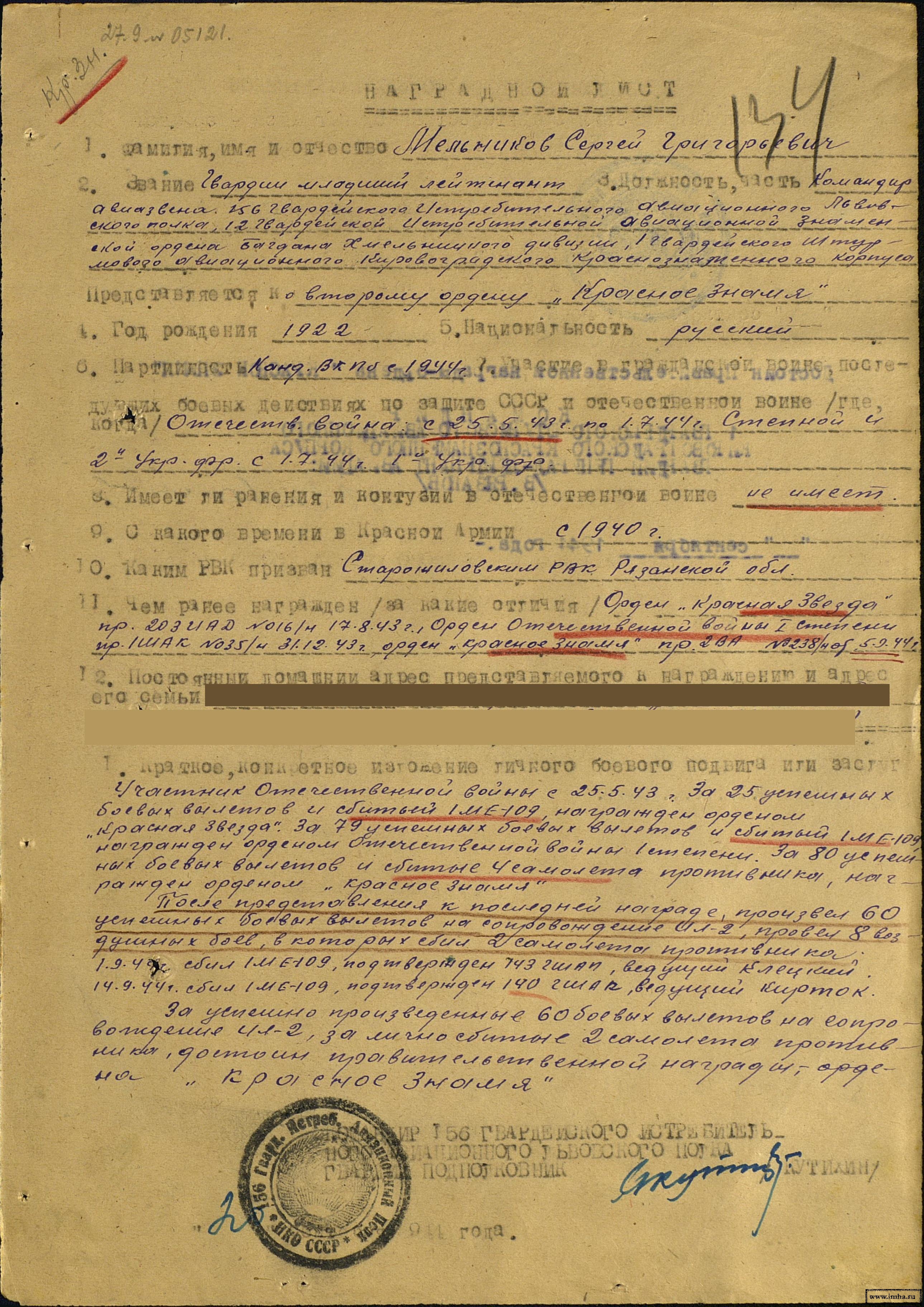 Из Нагр.листа: «После представления к посл.награде, совершил 60 успешных боевых вылетов на сопровождение Ил-2, провел 8 воздушных боев, в которых сбил 2 самолета противника:1.09 и 14.09.1944г. по 1 Ме-109».