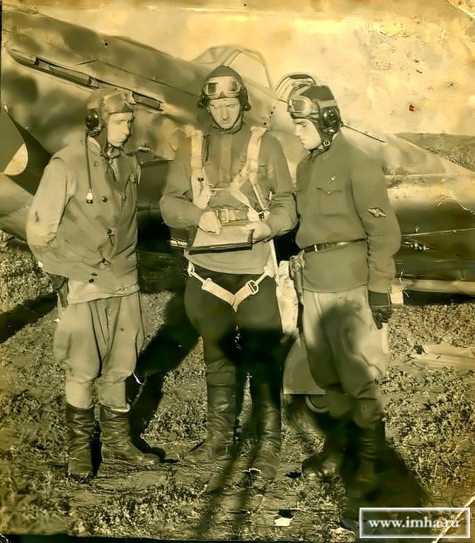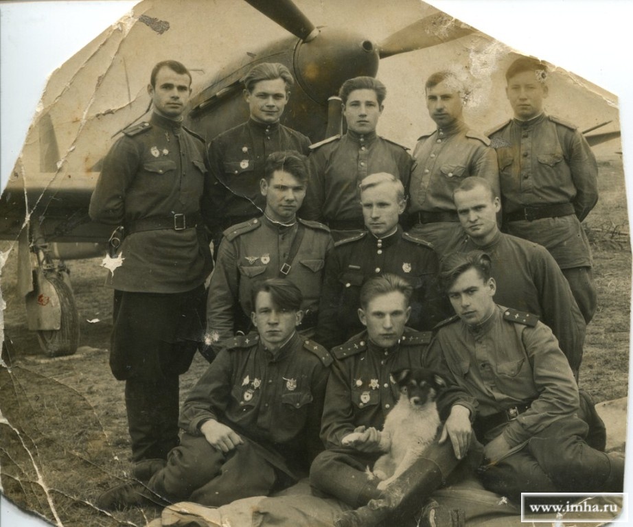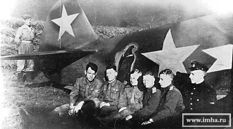 слева направо:капитан Шевчук Василий Михайлович,1919 г.рож. Заместитель командира эскадрилии 156гиап,Был ранен в воздушном бою в мае 1942 года.В дальнейшем будет командиром 152 гиап, 12гиад, 1гшак; капитан КАРНАЧ СТЕПАН АНДРЕЕВИЧ,1918 г. рож, с декабря 1944года будет назначен командиром 156гиап,вместо подполковника Кутихина Я.Н; Кутихин Яков Назарович,1912г.рож, до декабря 1944 года командир 156гиап; Безбередный майор; ст.лейтенант Сивцев; старшина Александров |