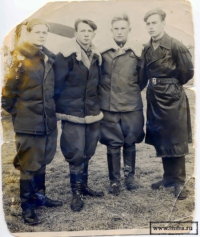 Летчики 156 ГИАП Нефедов Василий Григорьевич. Мельников Сергей Григорьевич, Шаманский Анатолий Федорович (ГСС), Сметана Николай Акимович. 30.10.1944 (Слева направо) |