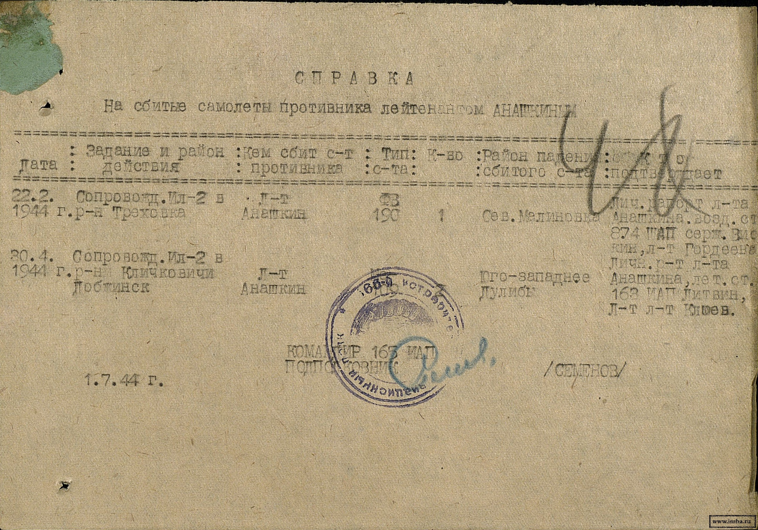На выполнение боевых заданий тов.Анашкин летает ведущим пары Ла-5.Выполняя боевые задания по сопровождению не смотря на огонь ЗА и плохие метеусловия тов.Анашкин все задания выполнял отлично. Как летчик-истребитель подготовлен хорошо, в воздухе ведет себя смело и уверенно.