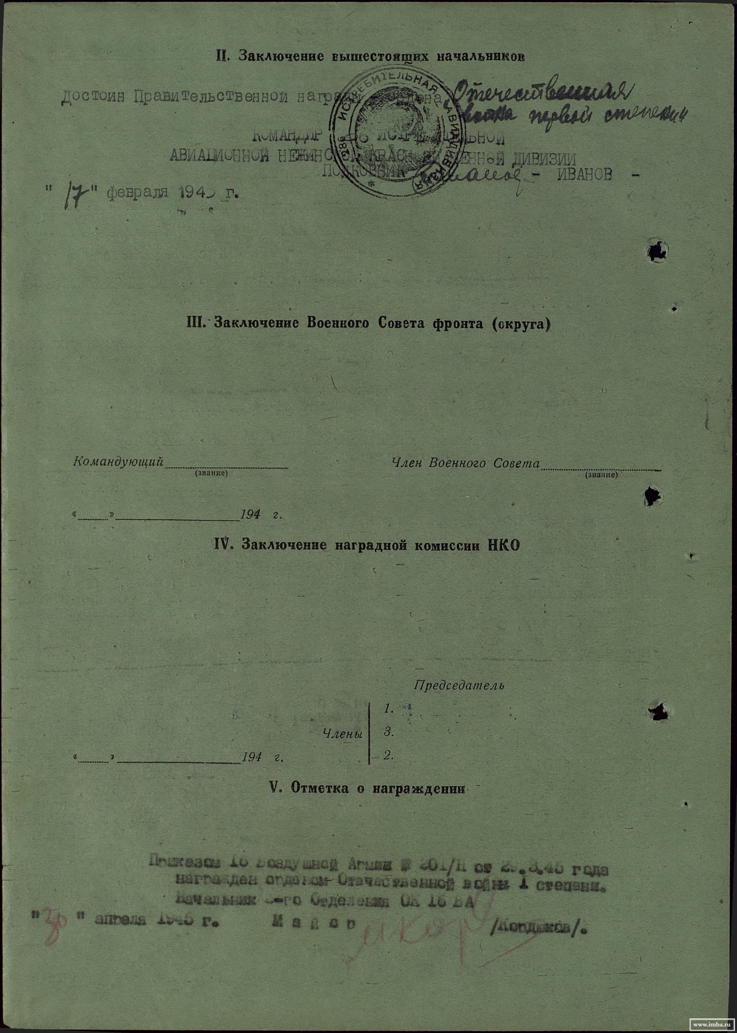 2.Фронтовой приказ №: 95/н от: 18.02.1944.Издан: ВС 16 ВА.Архив: ЦАМО,фонд: 33,опись: 686044,ед.хранения: 3730,№ записи: 20881784.