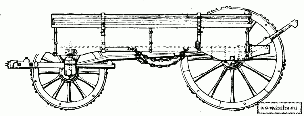 Для боевых припасов введены 4-колес. зарядные ящики в виде дышловой фуры с коробом, с двускатной крышей (фиг. 3).