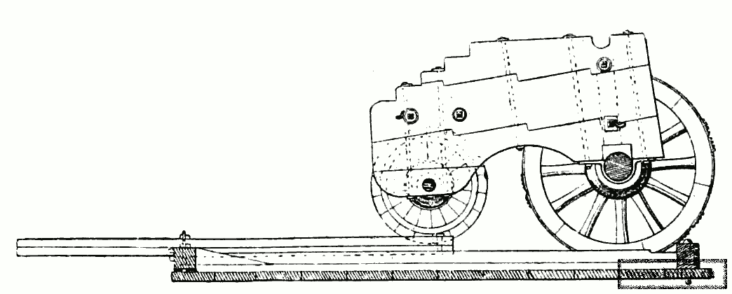 В лафетах для осадной и крепостной артиллерии повышена высота цапф до 5 фт., вместо 3 ? фт. Лафет был поставлен на колеса; в крепостной артиллерии введены поворотные платформы (фиг. 4), а в береговой — поворотные рамы с катками на рельсах (фиг. 5).
