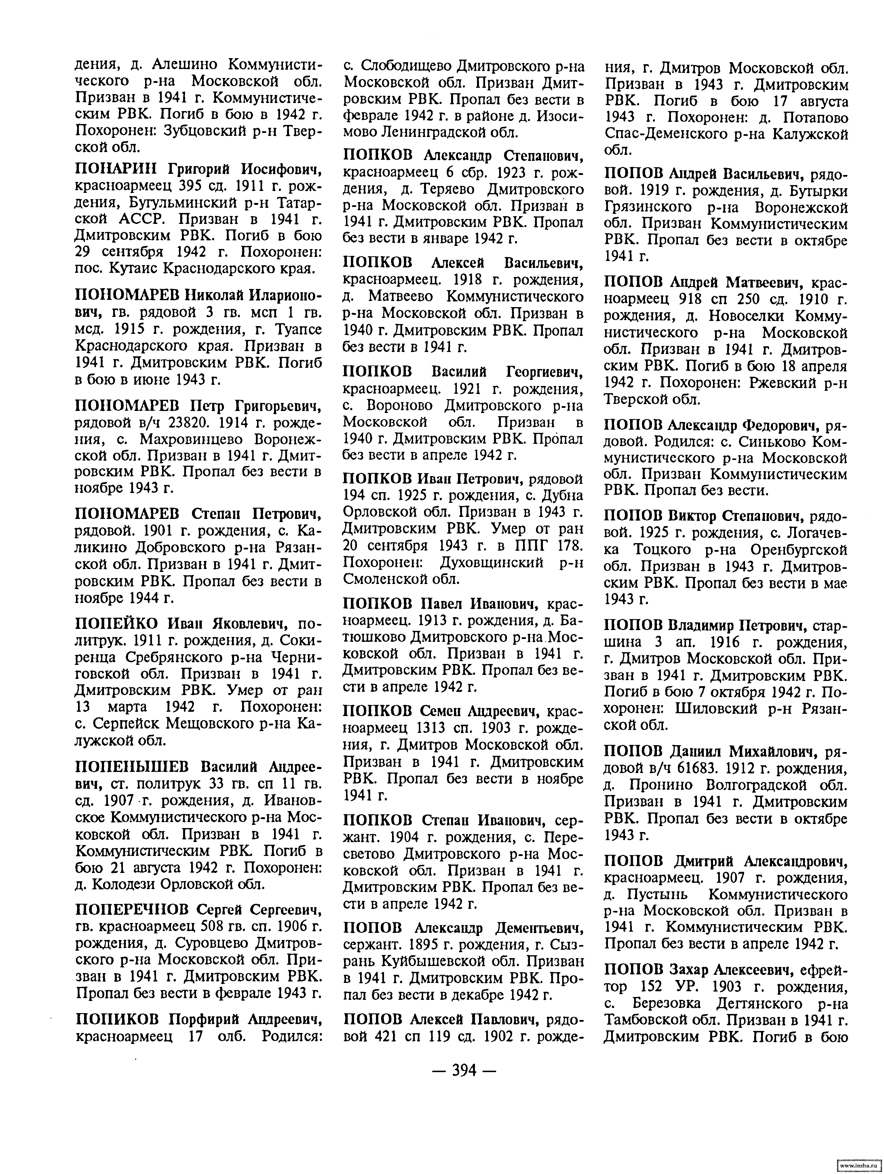 2.Штурман самолета Ли-2, 3-го транспортного авиаполка 2-й авиационной дивизии особого назначения, старшина Владимир Петрович Попов. Родился 3 апреля 1916 г. в г.Дмитров Московской области.Призван в 1941 г.Дмитровским РВК. По данным потерь л/с, отмечено: «Погиб в бою 7 октября 1942 г.» ЦАМО:Ф-58,Опись-818883,дело -2044,л.4