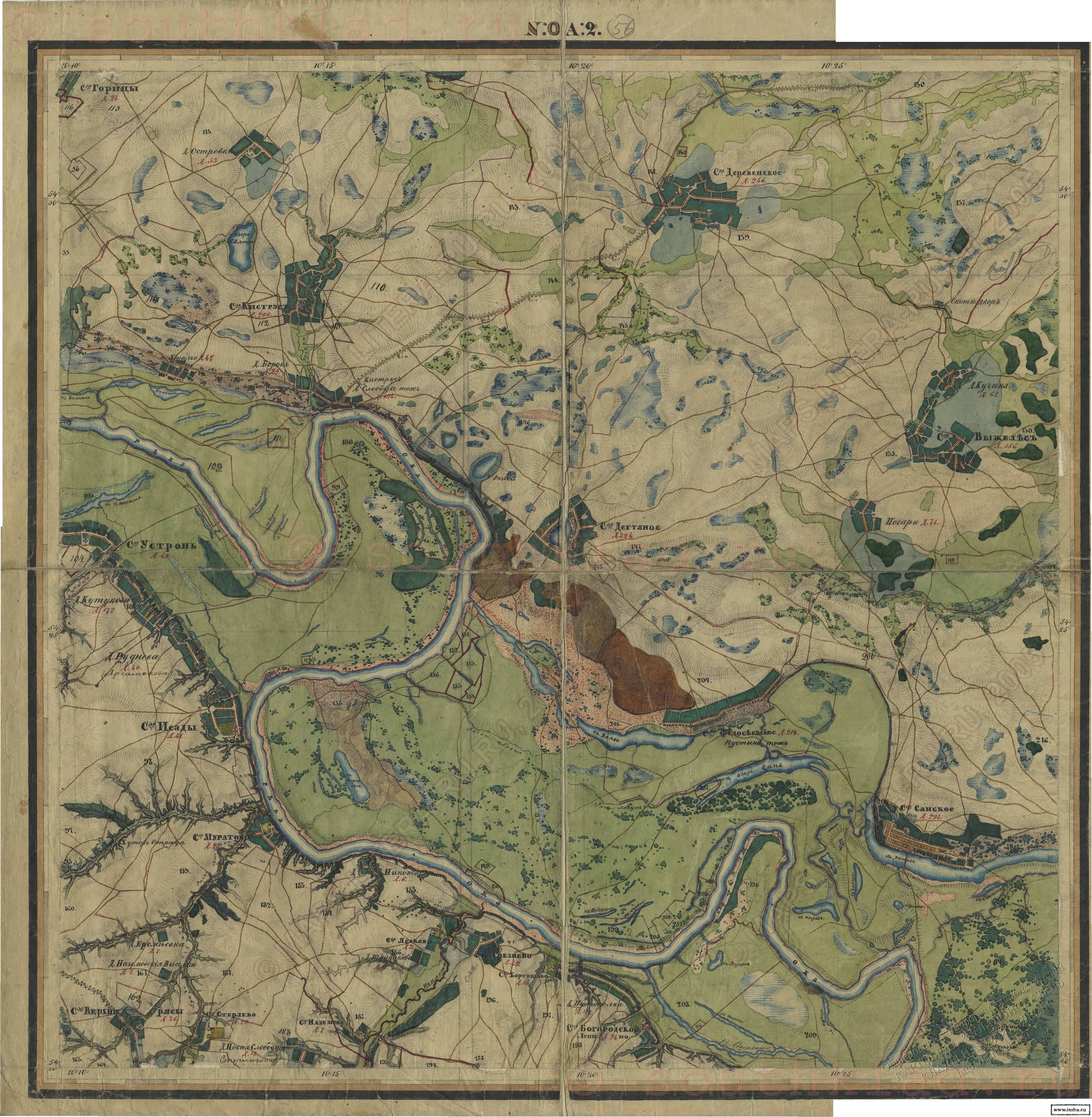 Внизу карты, по ее средине показано оз.Воинское, слева д.Пустополка отмеченная в Сотной грамоте, данной в 1567(68) году писцами Иваном Юрьевичем Траханиотовым с товарищами на земельные владения Рязанского и Муромского владыки, как деревня на пустом поле. Рядом с.Богородское, в данном документе не указана, т.к. с 1514 г. являлась владельческим, и принадлежала роду Луниных.