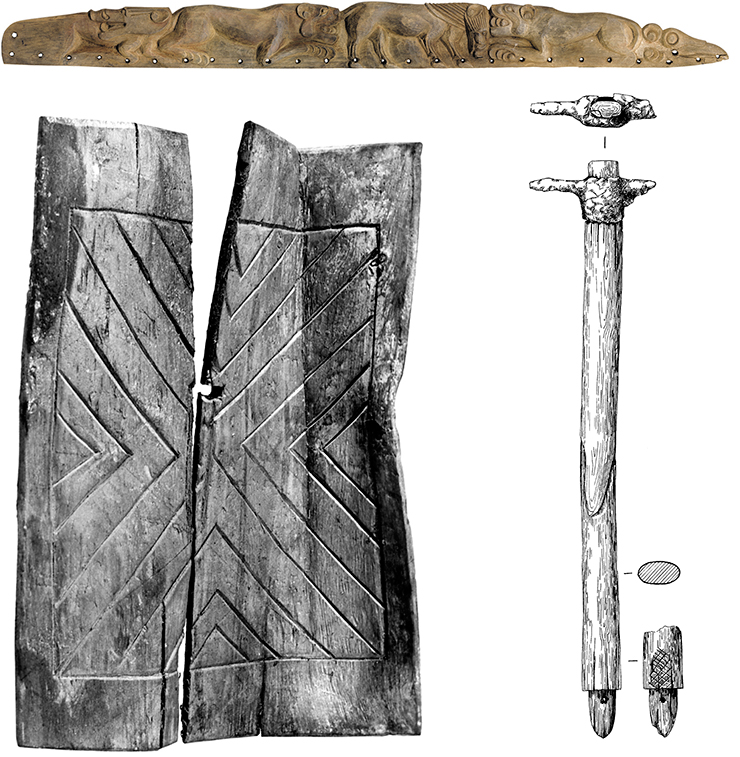 | Деревянная пластина – деталь горита, на которой вырезаны сцены «терзания» кабанов барсами из женского погребения (вверху). Защитное вооружение пазырыкских всадников представлено преимущественно щитами, сохранившимися в не ограбленных “Конских отсеках“. Деревянный щит (слева). Железный чекан на деревянной ручке из женского погребения (справа). Курган № 1, могильник Ак-Алаха-1 |
