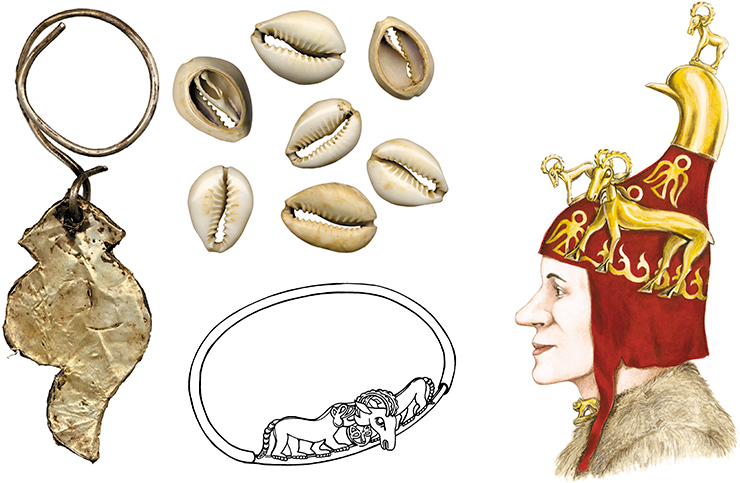 | Серьга из женского погребения представляла собой деревянную пластинку, обклеенную золотой фольгой (слева). Раковины каури – символ женской плодовитости (вверху). Гривна из погребения (внизу). Справа: рисунок к.и.н. Д. В. Позднякова (ИАЭТ СО РАН) по реконструкции войлочного шлема Е. В. Шумаковой (ИАЭТ СО РАН). Курган № 1, могильник Ак-Алаха-1 |
