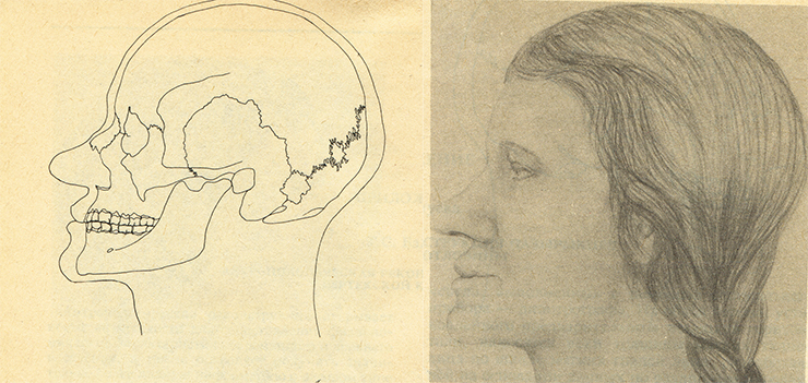 | Контурная реконструкция по черепу женщины (слева). Графический портрет женщины (справа). Реконструкция к.и.н. Т. С. Балуевой (Институт этнологии и антропологии РАН, Москва). Погребение 2, Курган № 1, могильник Ак-Алаха-1 |