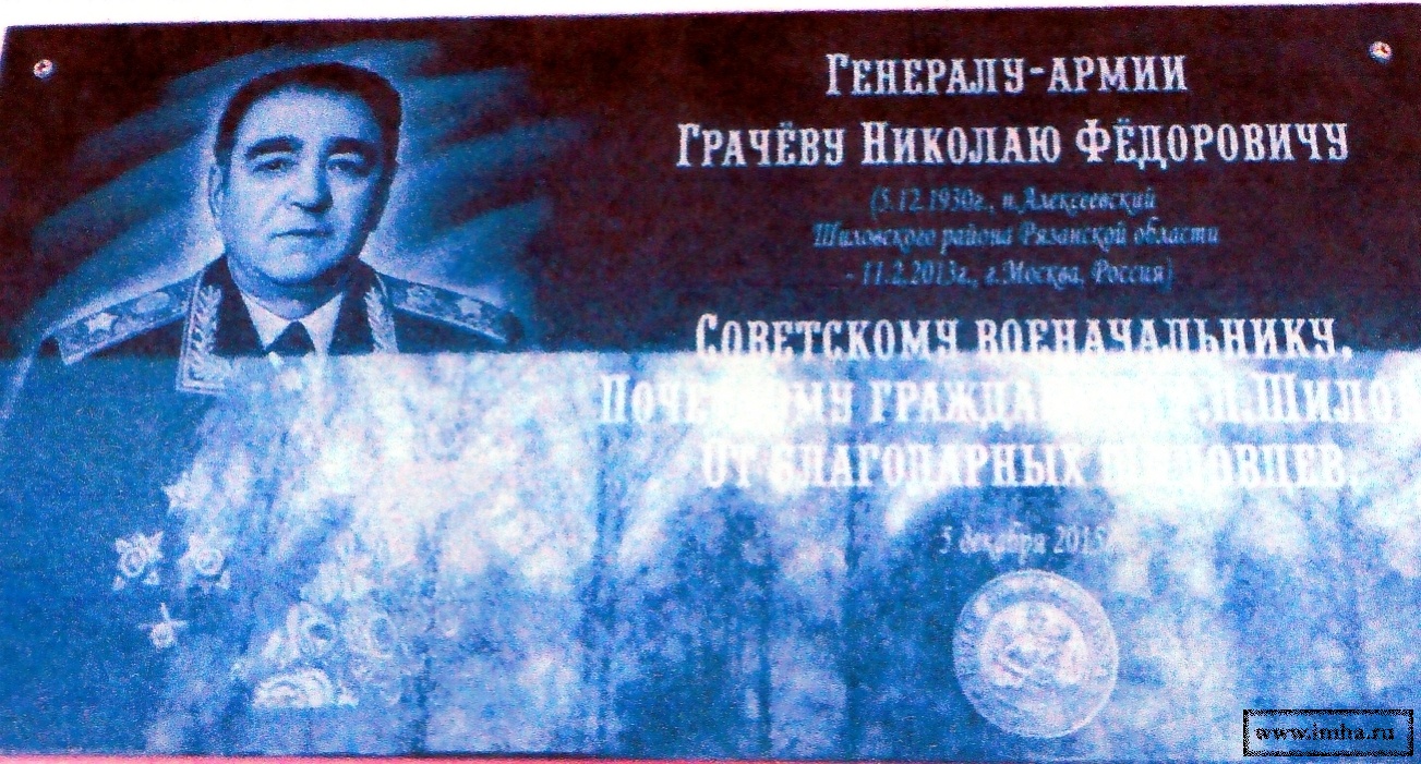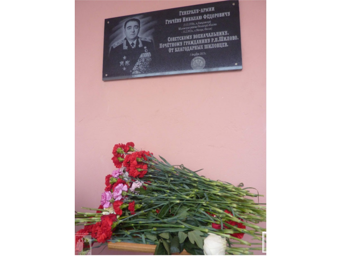 5 декабря 2015 года в Шилове Рязанской области открыта мемориальная плита генералу армии Грачеву Николаю Федоровичу – советскому военачальнику, Почетному гражданину р.п.Шилово.Данное событие произошло по решению Главы Шиловского района в день 85-летия со дня рождения Грачева Н.Ф., на котором присутствовали жена генерала, дочь, внучка и правнучка, а также жители и гости поселка. |