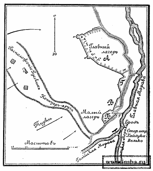 Между тем, 9 сентября гр. Орурк, располагавший, вместе с сербами, отрядом в 3 т. ч., узнав об усилении турок и намерении противника снова атаковать нас у Варварино, начал укреплять свой лагерь ретраншементом (А) и несколькими редутами (Б, В и Г).