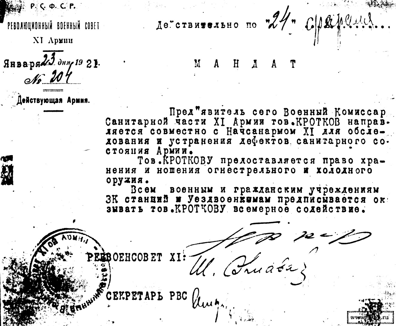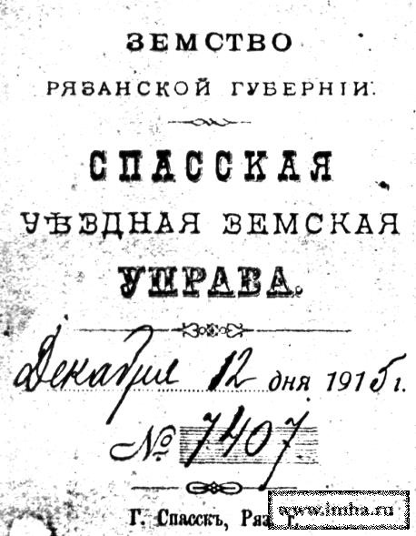 УДОСТОВЪРЕНIЕ Спасская Уъздная Земская Управа симъ удостовъеряетъ, что предъявитель сего, крестьянинъ села Мосолова / Успенское тожъ /, Ряской волости, Спасскаго уъезда, Федоръ Григорьевичъ Кротковъ, состоялъ на службъ Спасского земства въ аптечномъ земскомъ складъ и въ аптекарскомъ магазинъ съ декабря мъсяца 1909 года по 12 декабря 1915 года, при чемъ съ I сентября 1914 года былъ въ аптекарскомъ магазинъ отвътственнымъ завъдующимъ, обязанности свои исполнялъ с знанiемъ дъла, добросовъстно и аккуратно и службу оставилъ вслъдствiе призыва на военную службу. |