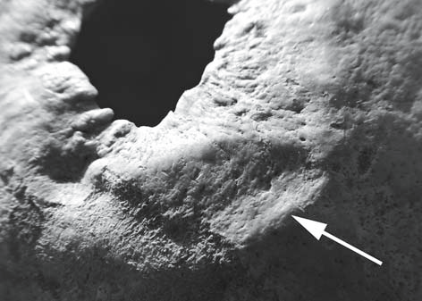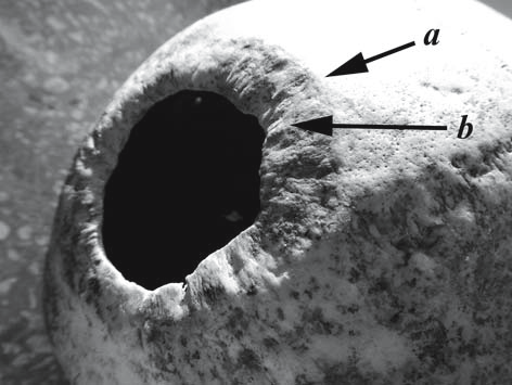 На первом, основном этапе трепанации с помощью острого режущего инструмента был удален поверхностный слой кости без прободения черепа. Следы такого рода действий хорошо прослеживаются на поверхности мужского черепа из кург. 3 курганной группы Кызыл-Джар V Участок с этими следами отражает характерную кинематику режущего инструмента. Плоскость срезания кости расположена по касательной к сферической поверхности черепа (рис. 2, а). Проникновение режущего инструмента на первом этапе производилось под относительно более острым углом, чем на втором. Плоскость резания при прободении кости имеет заметно больший угол наклона внутрь объема черепа (рис. 2, б). При выполнении двух этапов операции, вероятно, использовался один и тот же инструмент. Но различия в ориентации плоскостей резания предполагают, что при удалении поверхностного слоя кости его движения имели относительно длинный «рабочий ход», а при прободении черепа они были более частые и короткие. Следы резания кости на первом этапе имеют вид