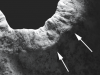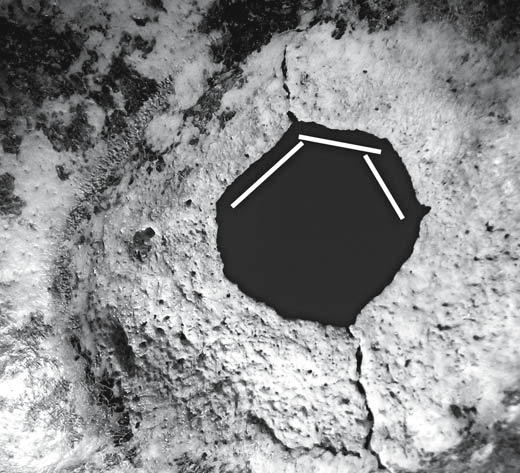 При описании следов первого и второго этапов резания черепной кости следует отметить и отличия в дислокации оперативных действий. Плоскость первого, поверхностного среза не всегда совпадает с, вероятно, заранее запланированным местом финального прободения черепа (рис. 5). Вполне возможно, что на первом этапе трепанации хирурги не придавали достаточно большого значения опасности своих манипуляций. Более точные действия прослеживаются при финальном прободении кости.