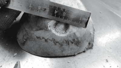 Экспериментальная проверка результатов трасологического анализа с определенной долей вероятности подтверждает наше предположение. Она заключалась в проведении трепанации на черепе трупа ножом достаточно распространенной у ранних кочевников Южной Сибири формы, изготовленным А.П. Боро- довским из сплава, содержащего медь, олово и цинк (рис. 7). Экспериментальная операция осуществлена одним из авторов статьи, практикующим нейрохирургом. Для получения отверстия диаметром 25 мм и обнажения твердой мозговой оболочки потребовалось 28 мин (рис. 8). Существенное уточнение модели операции, предложенной по результатам трасологического анализа следов трепанаций на пазырыкских черепах, относится к начальному моменту ее выполнения. Используя характерную форму кончика ножа, хирург формировал отверстие в компактном слое кости в центре операционного поля, продвигаясь затем к его периферии.