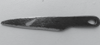 В собрании Минусинского краеведческого музея также выявлены четыре артефакта, следы износа на которых позволяют определить их как пилы по относительно твердому органическому материалу (рис. 9, 6). Трасологический анализ рабочей поверхности инструментов выявил ряд признаков, свидетельствующих об их использовании для пиления рога или кости. Не исключено, что перед нами еще один тип орудий, которые можно отнести к хирургическому инструментарию. Они не имеют аналогов в европейских археологических коллекциях. Размеры изделий № 699, 700 и 701 составляют 213 х 30; 205 х 43 и 200 х 40 мм соответственно. Толщина лезвий у пил одинаковая и уменьшается от основания к окончанию с 2,5 до 1,5 мм. Зубья орудий образованы пропилами перпендикулярно к лезвию с помощью неустановленного инструмента. Развод зубьев изначально отсутствовал и сформирован позже, в процессе утилизации орудий. Обнаружены изделия у д. Паначево Курагинского р-на.