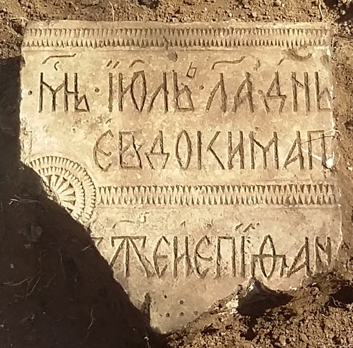 Оба надгробия датированы 31 июля 1512 года, днем Преподобного Евдокима. Значит, упомянутые на них люди умерли в один день. Под одним погребен некий Епифаний (остальное не сохранилось), под другим – инок Феодосий Исаков, сын Окулинин, «волоченин» (то есть из города Волочка). Под углами его плиты имелись опоры – сохранилась одна, в виде капители или базы маленькой колонны, стоящей на фрагменте вторично использованной чужой плиты.