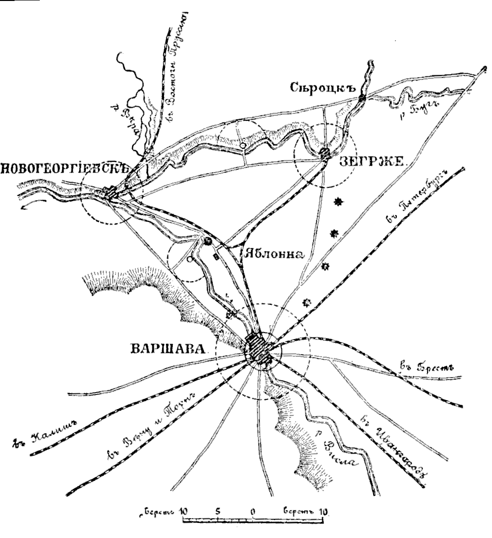 Варшавская линия пролегает по территории трех пограничных военных округов: Петербургского, Виленского и Варшавского и имеет первостепенное значение для успеха наших операций как по обороне западной границы, так и по подготовке нашего наступления в пределы Германии и отчасти Австрии.